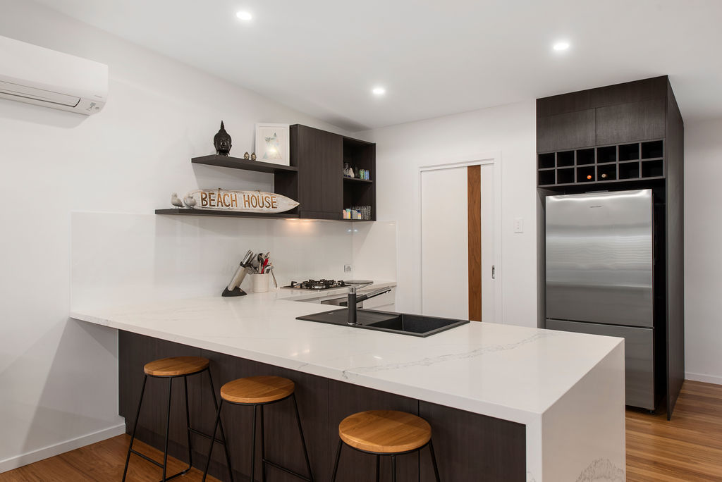 A feature and focal point of kitchen is the Black Oliveri sink and Blanco flick mix pull out spout.