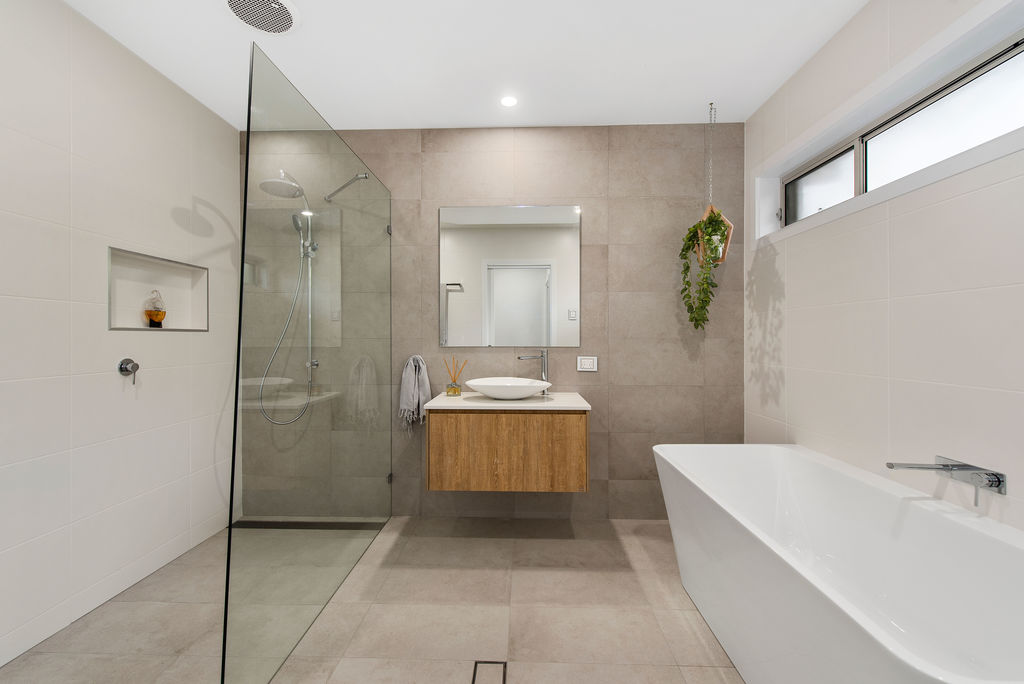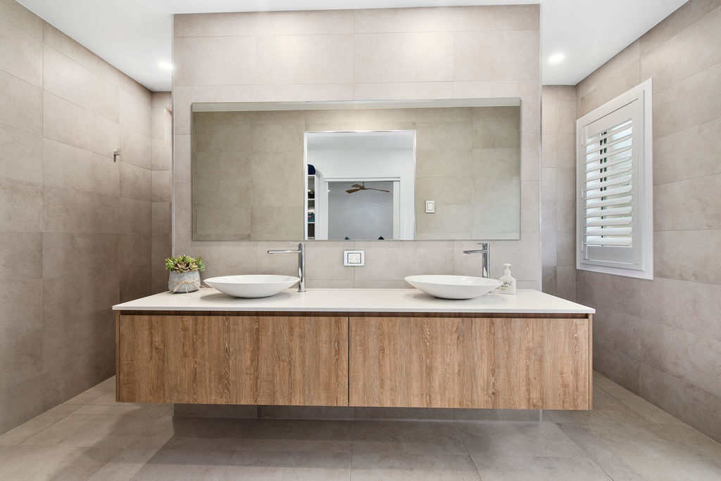 The master bedroom is a big 4 x 5 metres in size. Walk through wardrobe and double wall hung stone vanity is a feature with soft close toilet seat, separate shower with shower station and hand held spray, magnificent, impressive tiles to ceiling, ceiling heater and exhaust fans. Wow something really special.