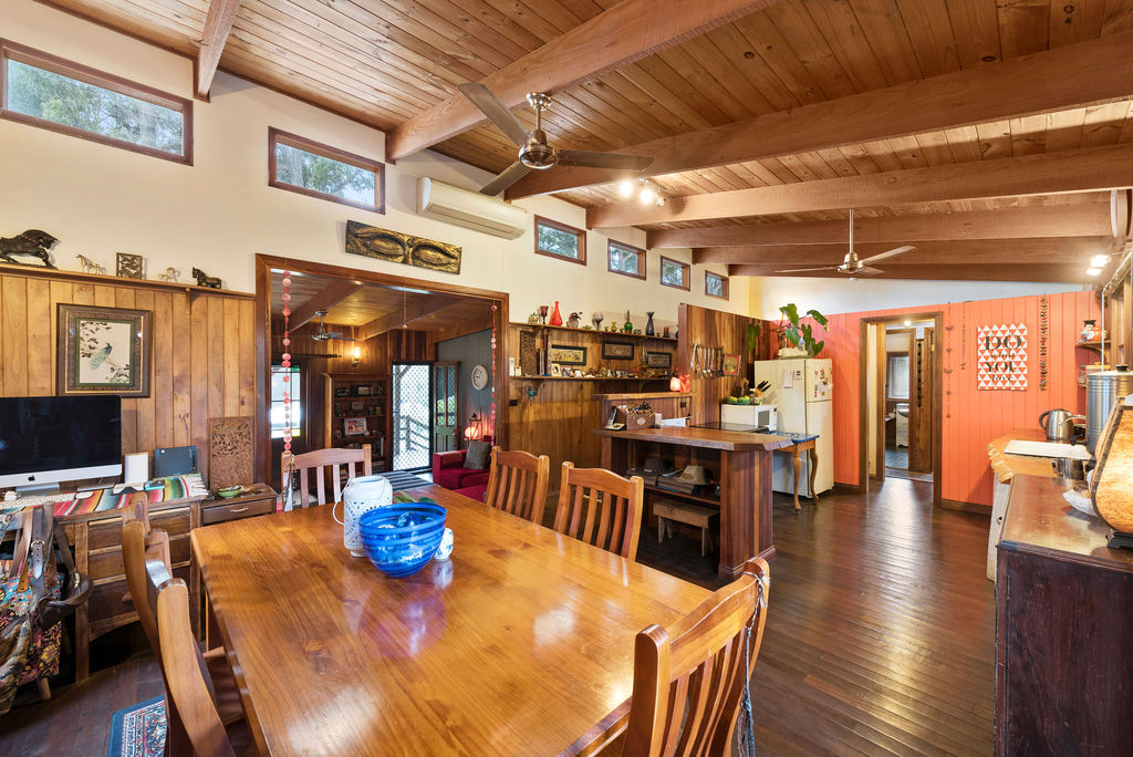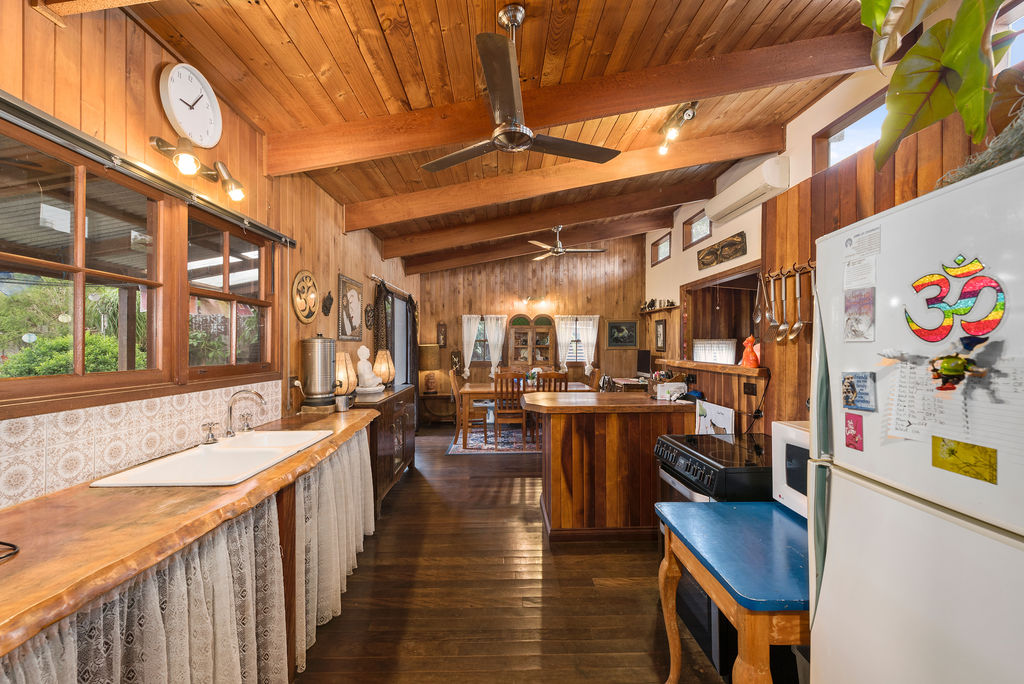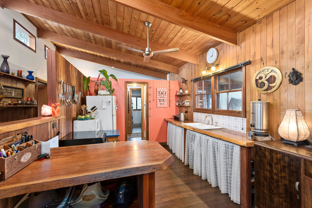 The kitchen is set in the heart of the home and is open to the dining space and a light-filled area of the home. The kitchen benches are beautiful slabs of timber, full of character .Basic but so suited to the feel of this home.