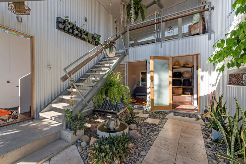 Architecturally designed, the home merges indoor and outdoor spaces with ease, using a central covered tropical courtyard and bi-fold doors to link the living areas, bedrooms and studio.