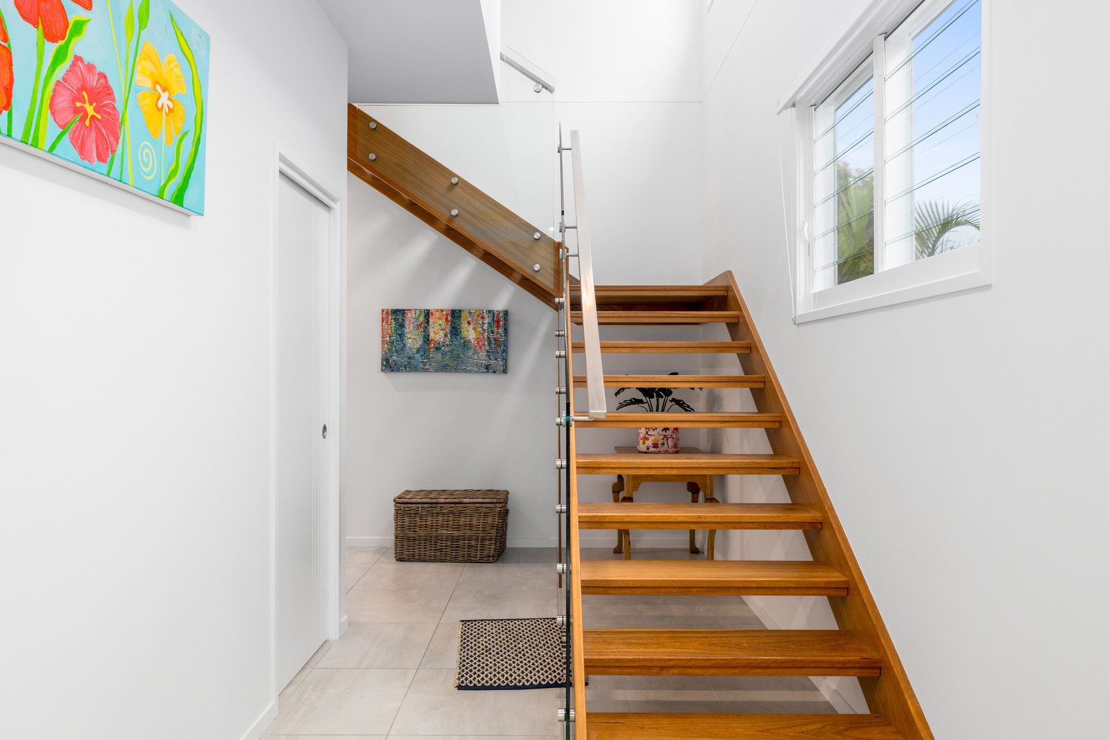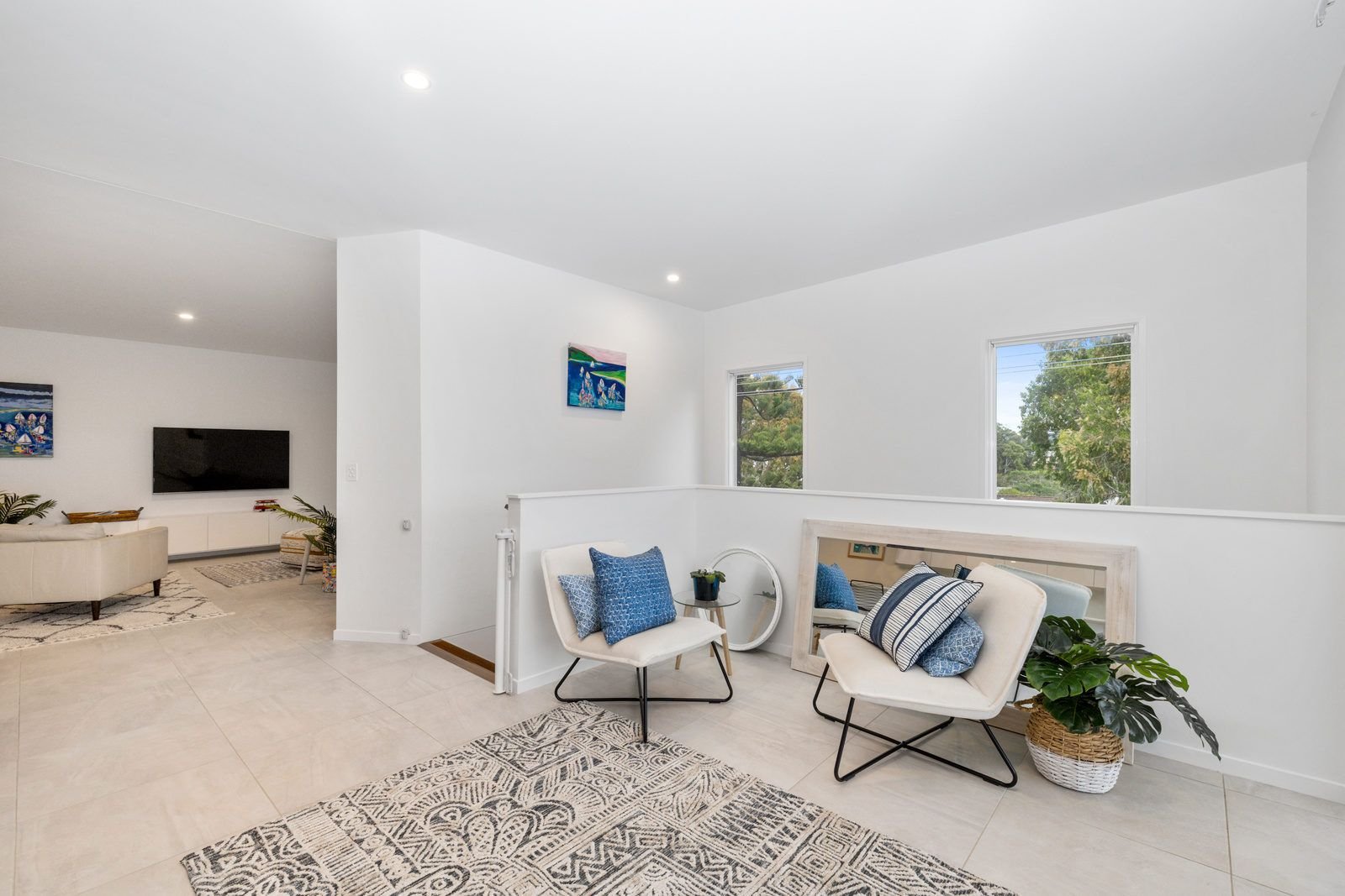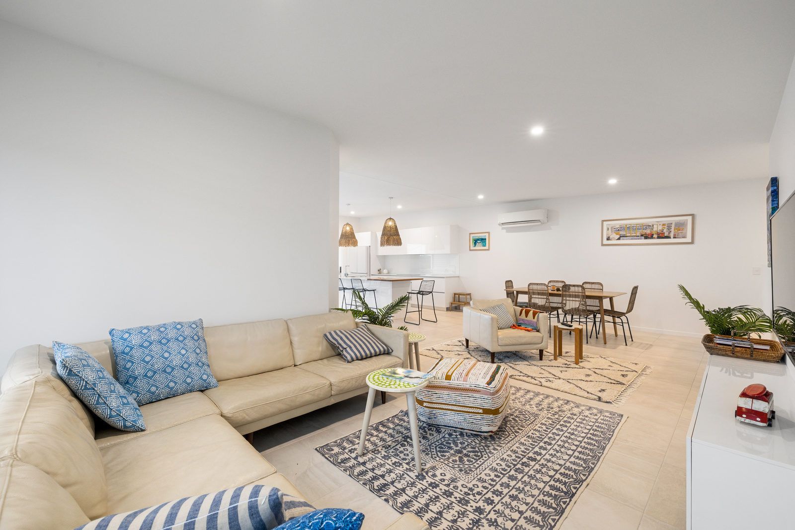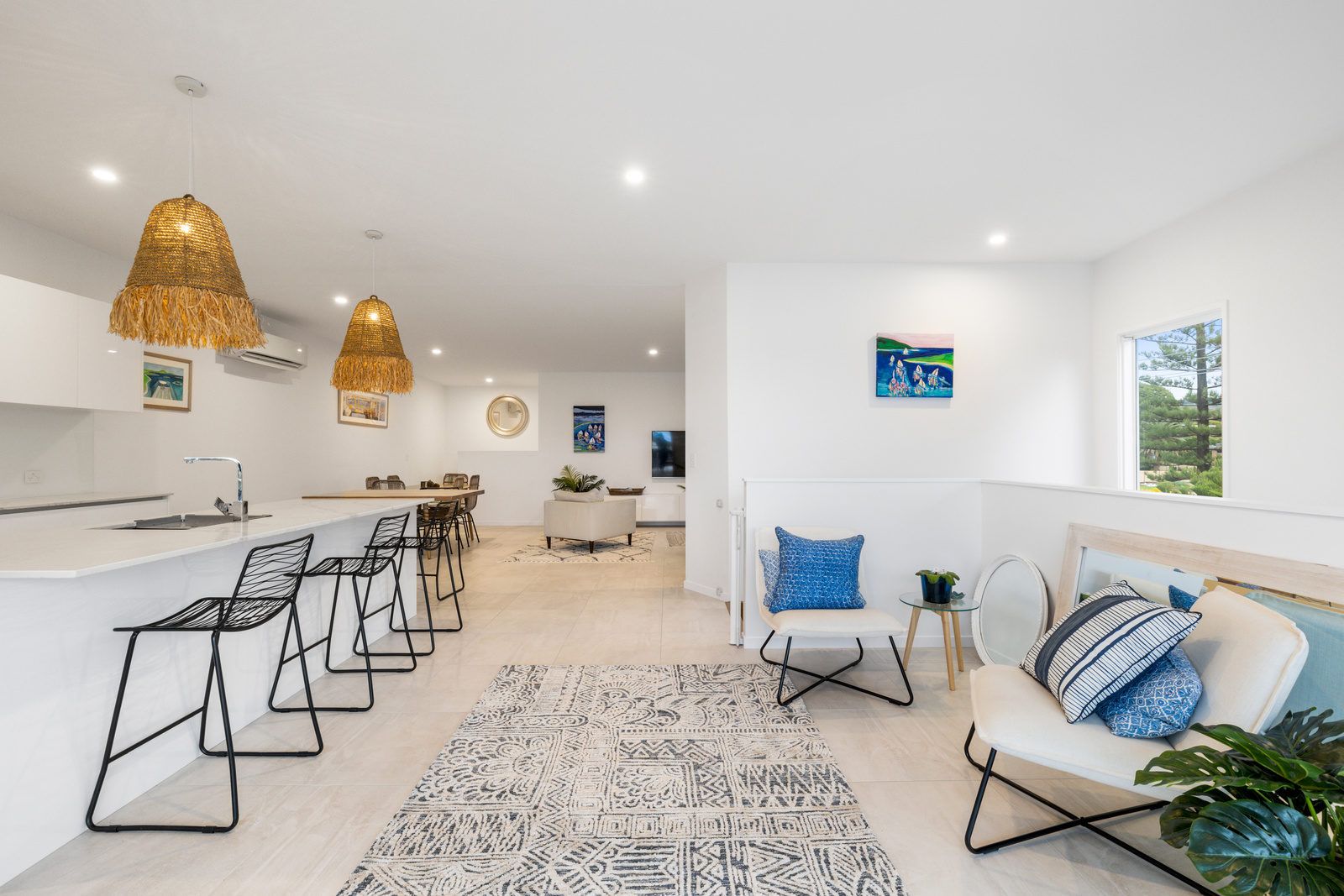Following the abundance of natural light & timber staircase you will be led to the upper level of this impressive holiday unit. On this level is the large open plan living, dining and kitchen area featuring stone bench tops, SMEG appliances & a generous butlers pantry. Continuing through the upper level you will find a powder room & master bedroom, which is equipped with a queen bed, ceiling fans, walk in robe & private ensuite. There is also an office space on this level for those who must bring their work life along with them.