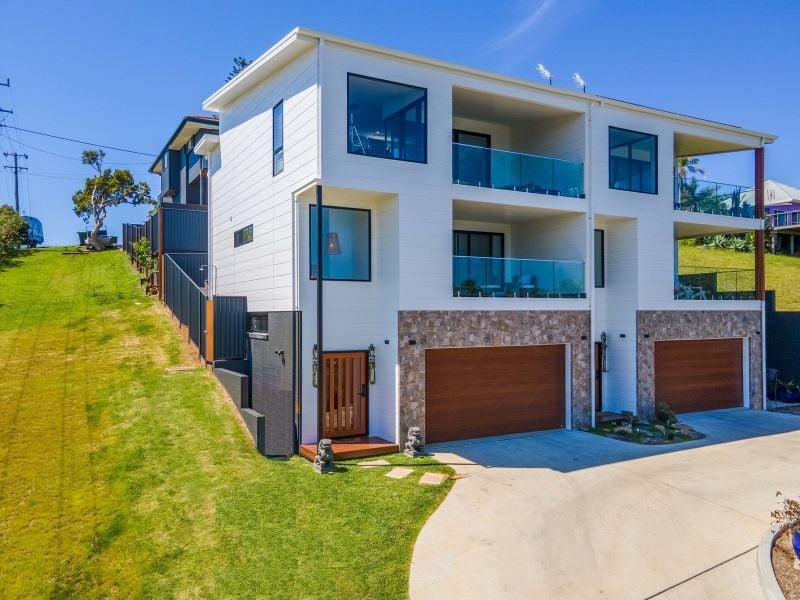The tri-level construction, part of a strata title duplex, is less than 6 months old and offers an opulent fully appointed townhouse with double garage and front entry on the ground level. Move upstairs to the first floor and you will find two generous sized bedrooms, main bathroom with freestanding bath, and separate laundry. This level also boasts two outdoor entertaining areas - the front deck looking south to Emerald Beach with ocean, island and mountain views, and the rear covered deck with spa, BBQ and alfresco dining, all protected so you can enjoy the outdoors year-round.