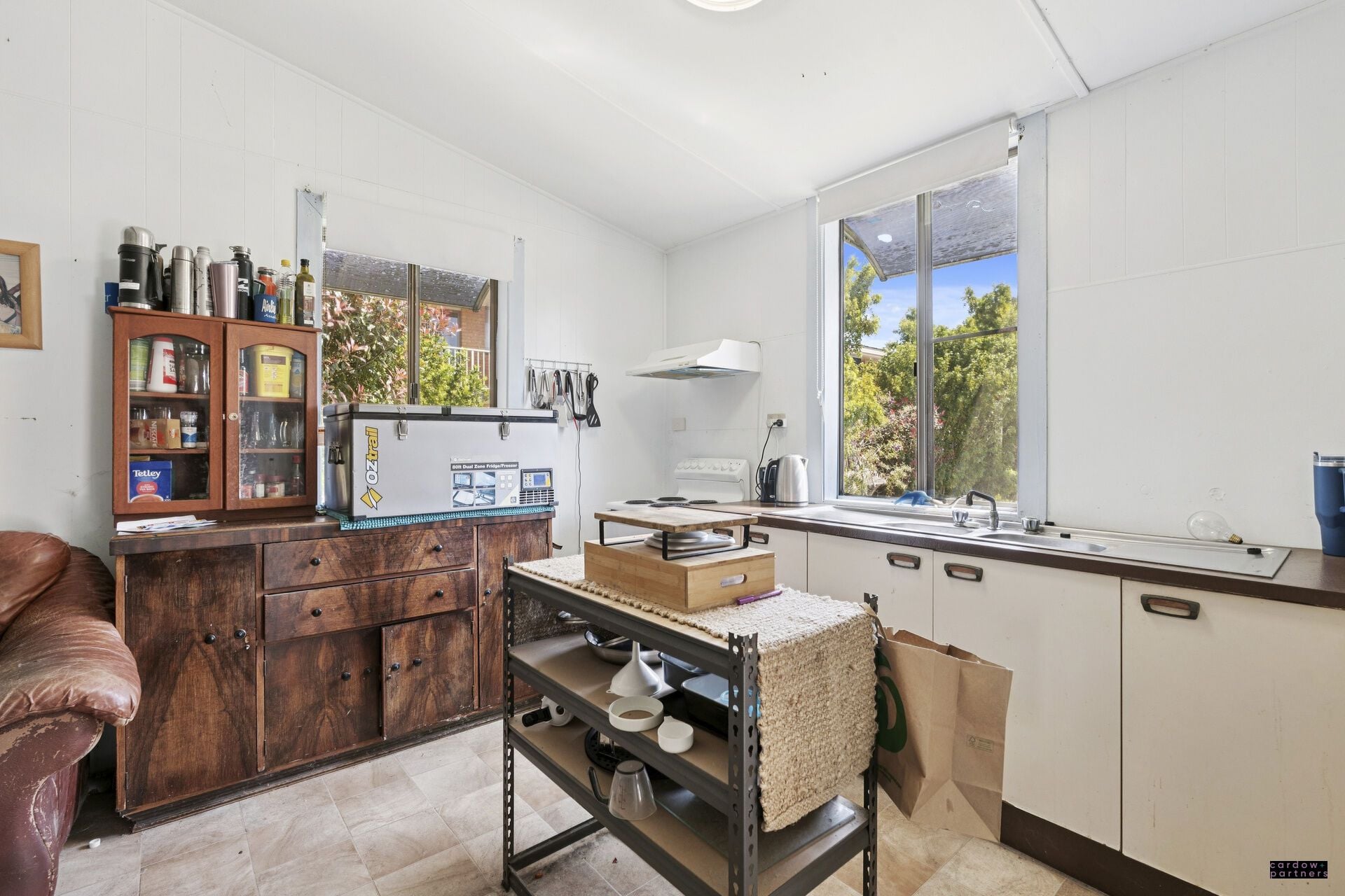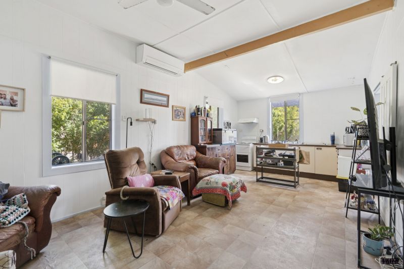 The cottage itself is full of charm, featuring high ceilings, a wrap-around verandah and a practical floorplan. Inside, there are two well-proportioned bedrooms, both with air conditioning, along with a separate formal lounge. The home provides year-round comfort with four air conditioning units, while the kitchen is equipped with an upright electric stove and the convenience of an internal laundry. Vinyl flooring flows throughout the living areas, with carpet in the bedrooms and lounge for added warmth.