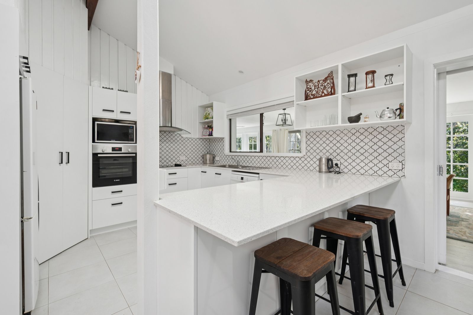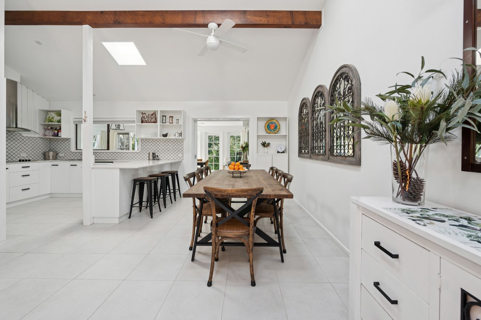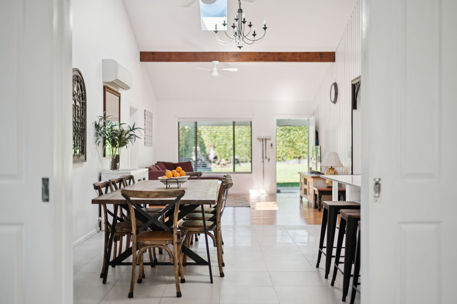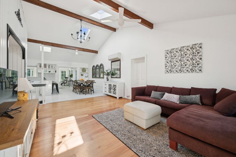 The heart of the home is the open-plan kitchen, dining, and main living area, showcasing soaring ceilings, exposed timber beams, and an abundance of natural light. A sunny second living space flows seamlessly onto a balcony overlooking beautifully landscaped gardens-a perfect setting for morning coffee or relaxed evenings.