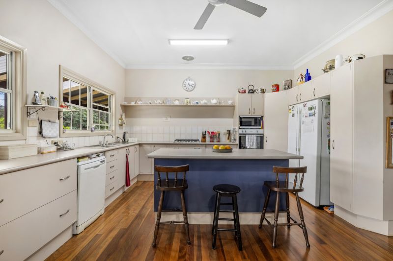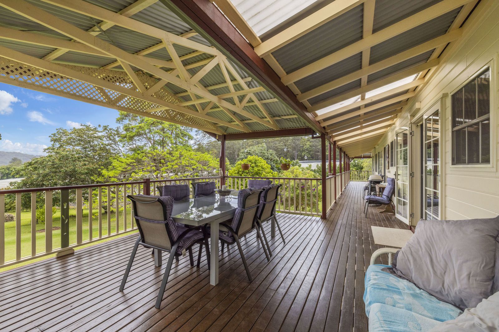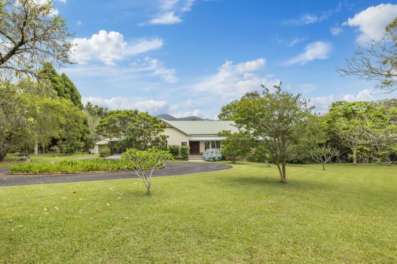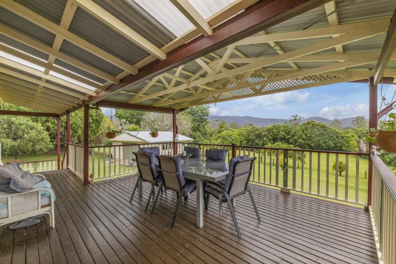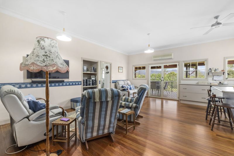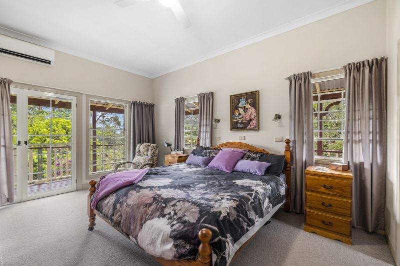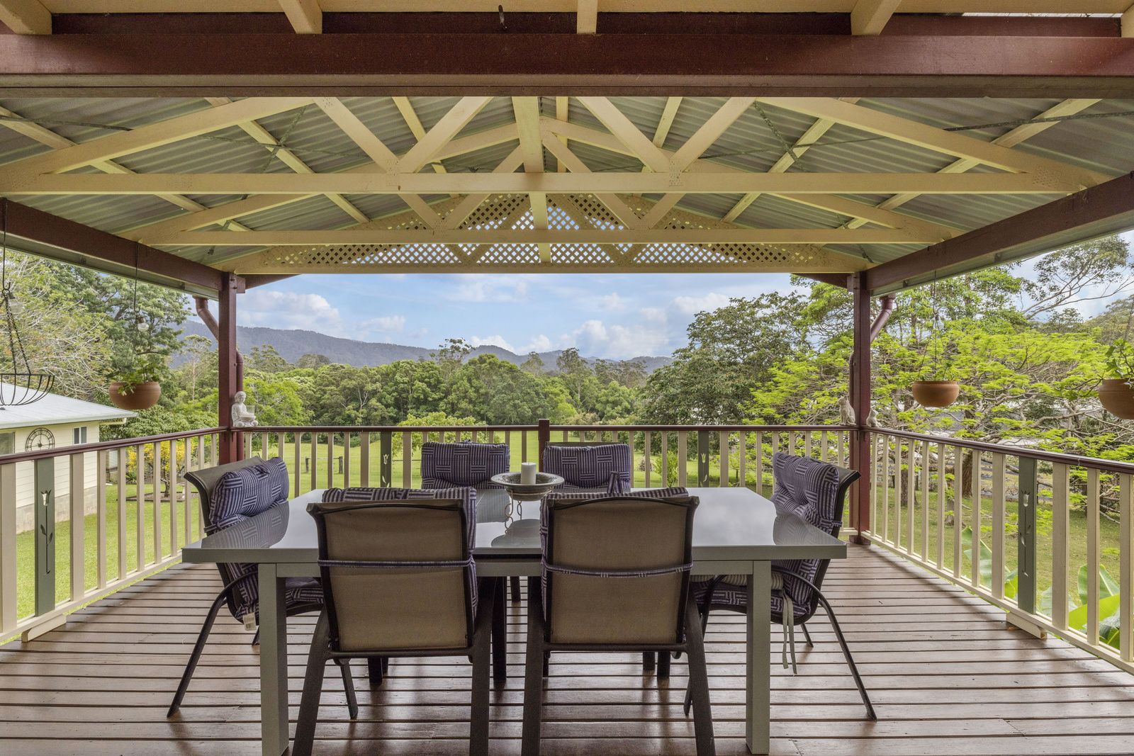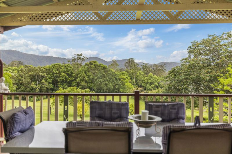 Promising a lifestyle of privacy and tranquility, The property features wide wrap around verandahs, warm timber floorboards, high ceilings throughout, and stunning mountain views. Spread over a flexible & spacious floorplan, the home boasts multiple living zones with access to the outside deck via numerous French doors, exuding a feeling of relaxation.