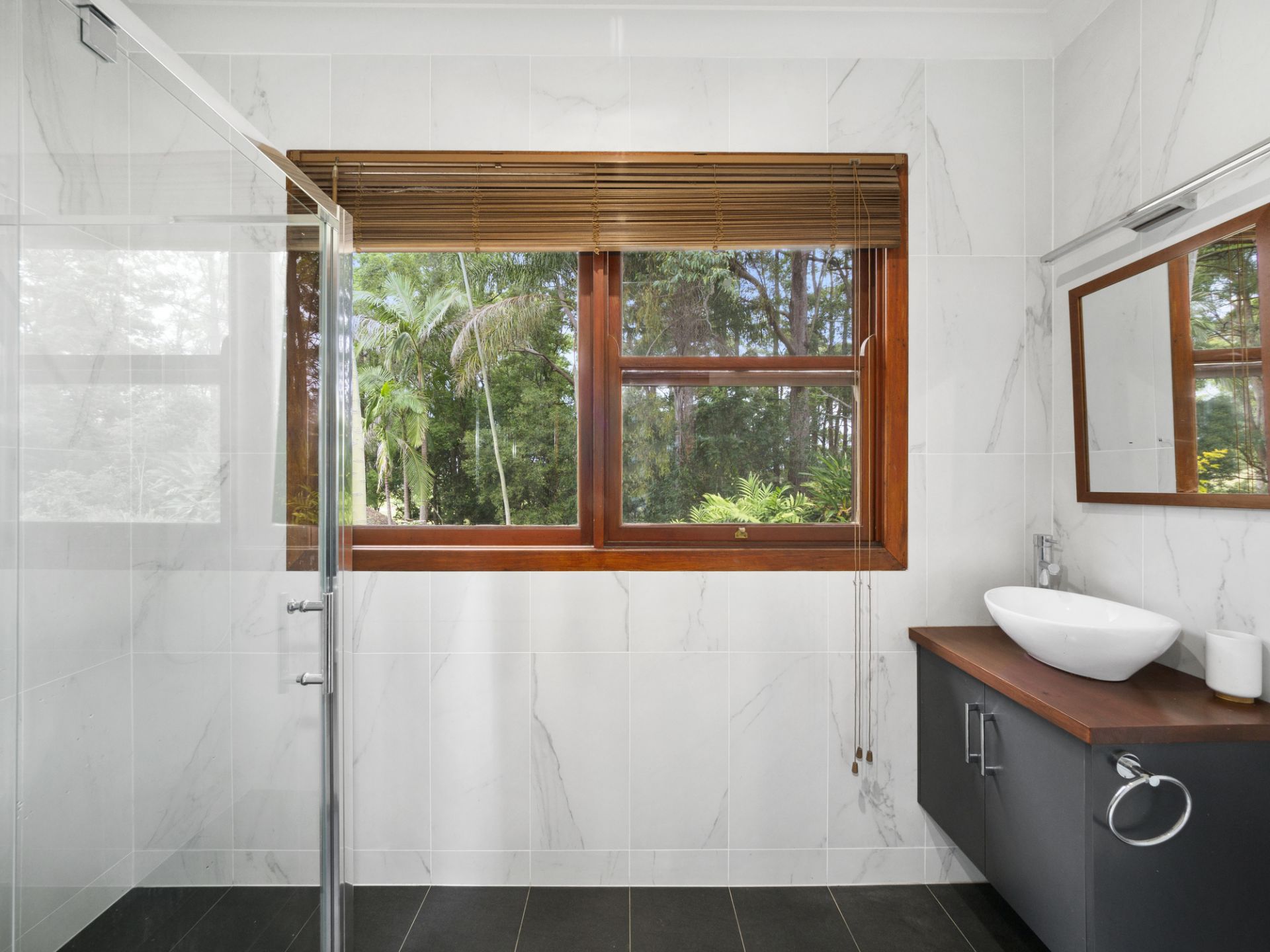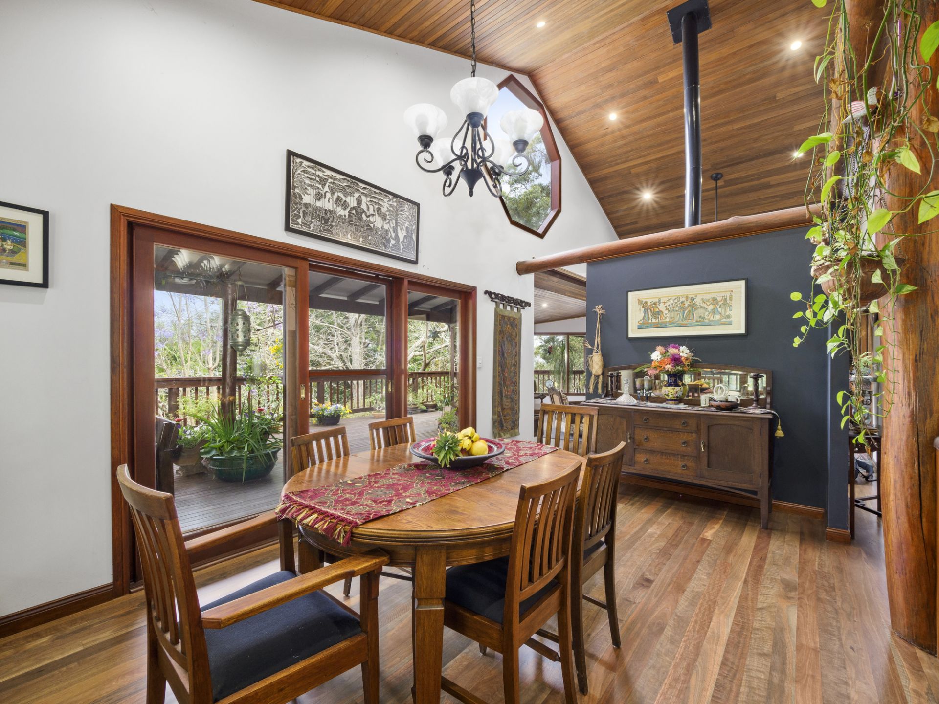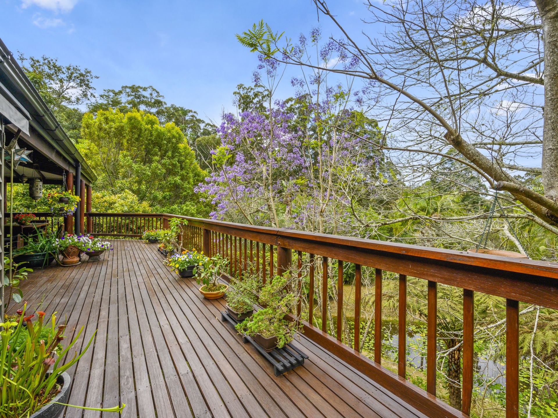 The exquisite timber kitchen is complete with modern appliances and walk in pantry, that flows effortlessly through the open plan dining room out to a wide verandah to take in the stunning views of the beautifully landscaped gardens and waterlily dam.