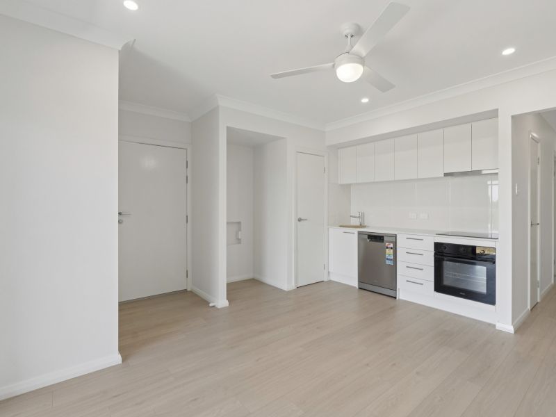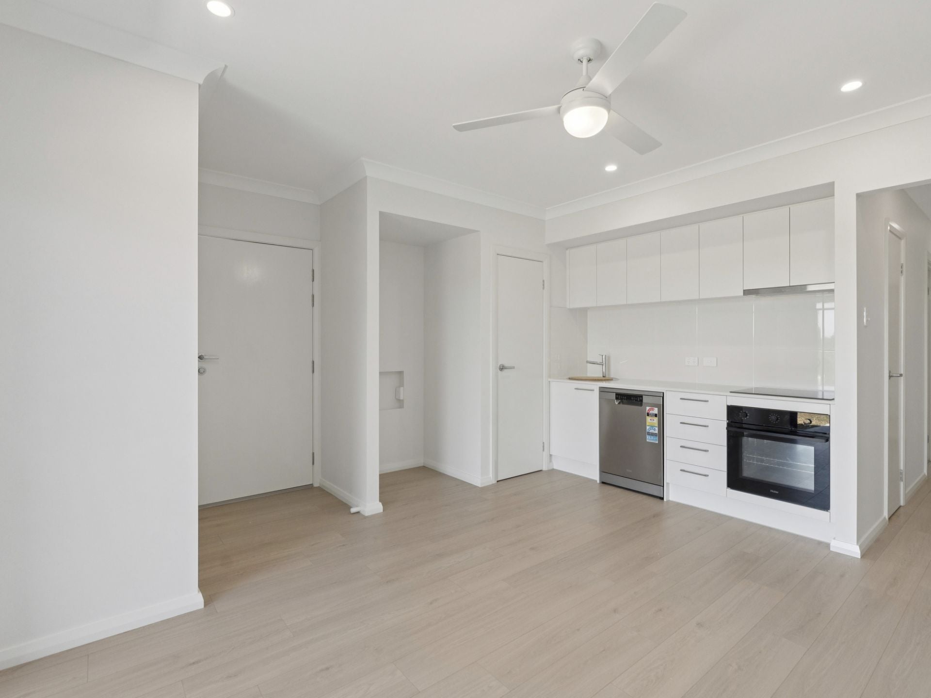 living and dining area equipped with a dishwasher and oven. A smart pocket-style laundry is thoughtfully integrated into the design, adding convenience without taking up extra space.