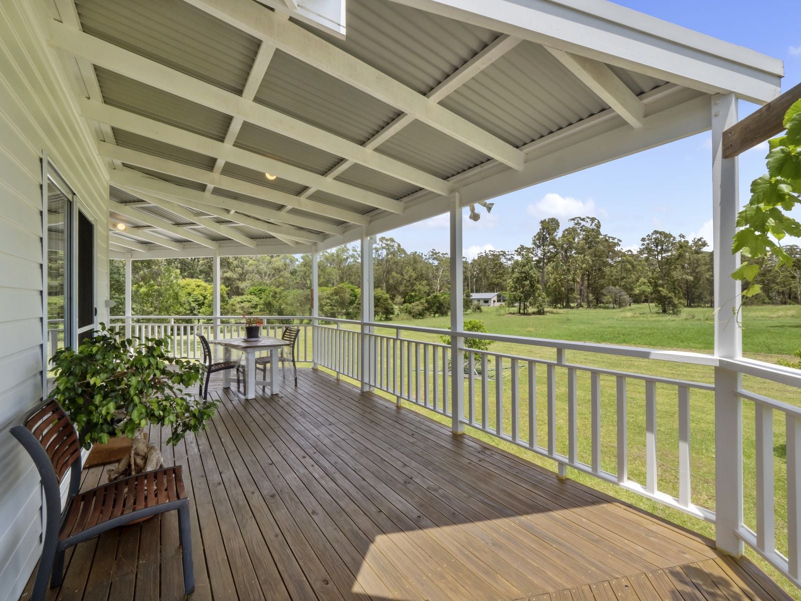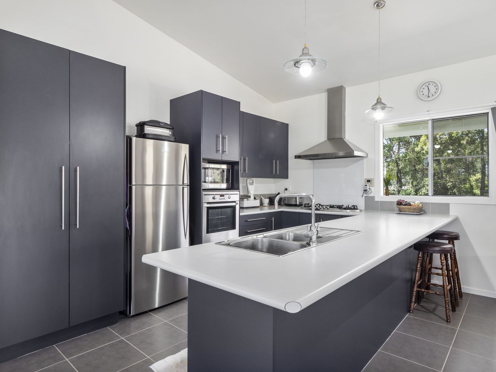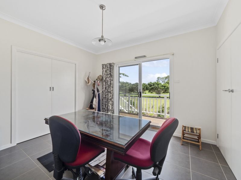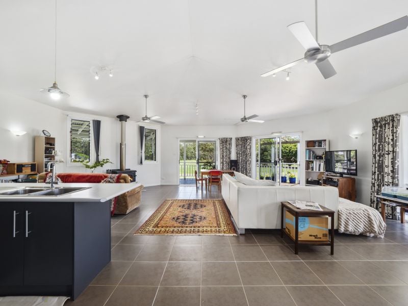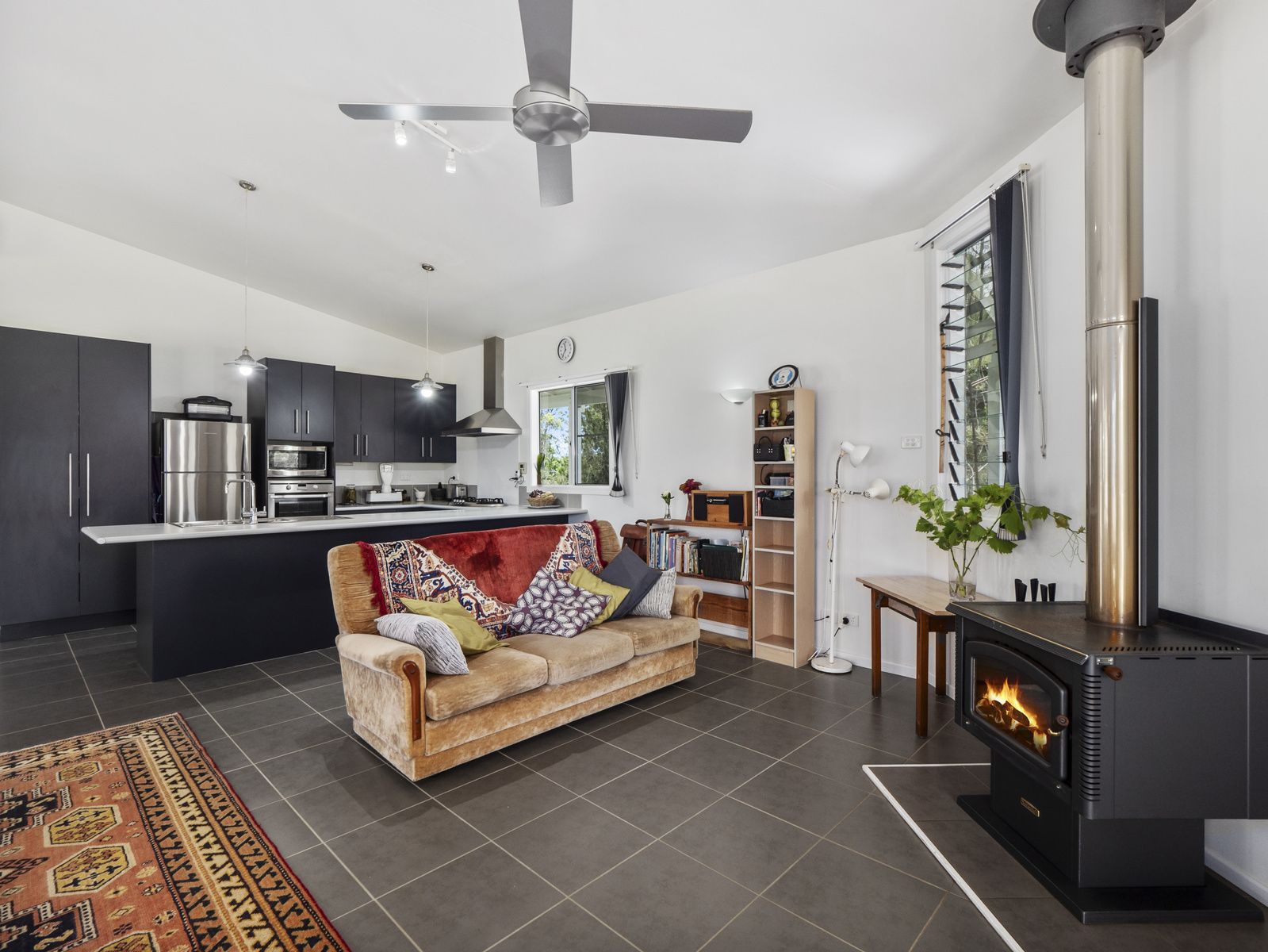 The elevated home features a large wrap around veranda, open plan living and dining with raked ceilings, fireplace, and an abundance of natural light through multiple glass doors and louvered windows providing the perfect rural landscape view. The kitchen is well appointed with top quality appliances including pyrolytic self-clean oven and large 900mm gas cooktop with dual wok burners.