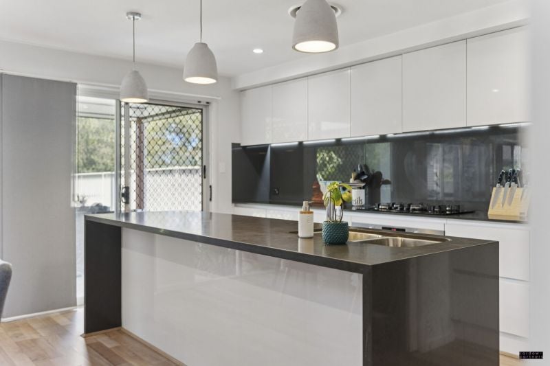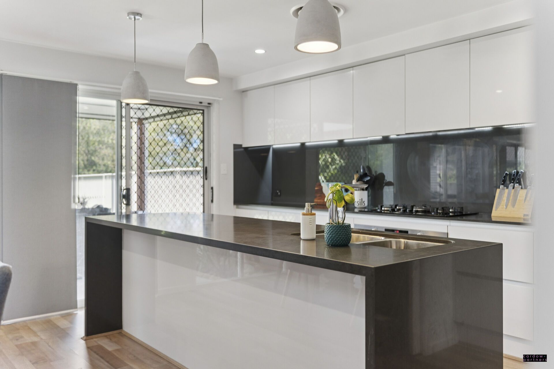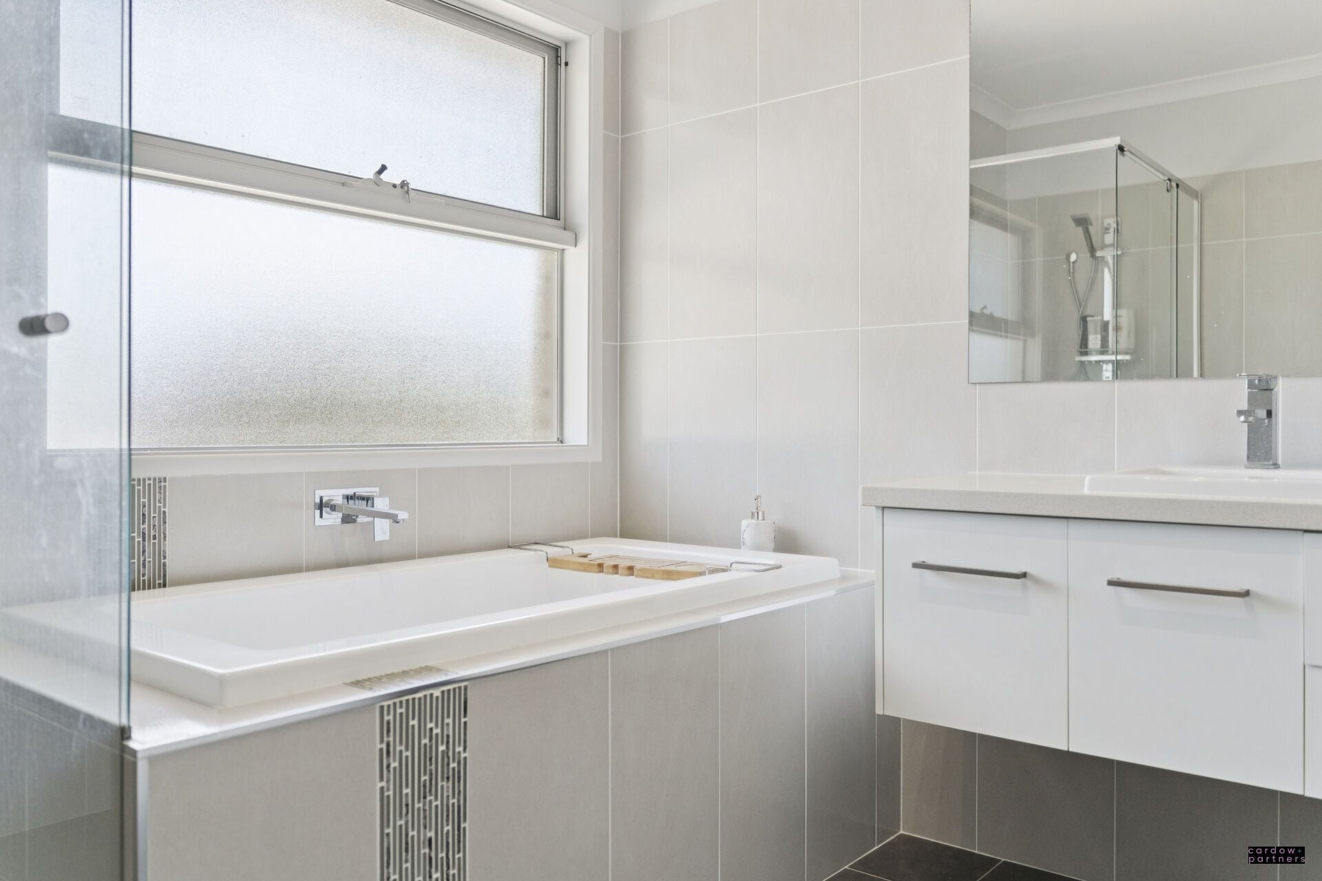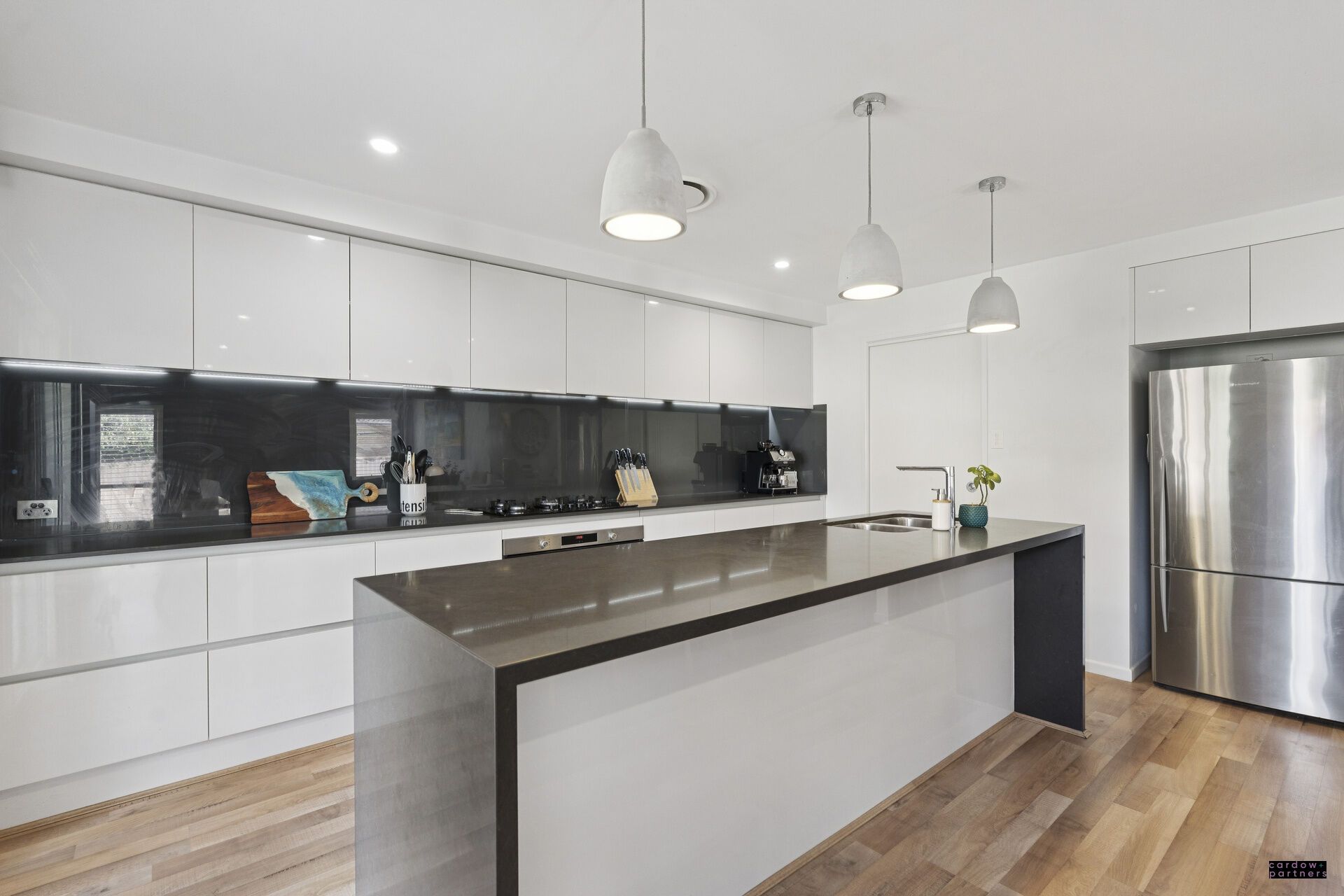 Step inside to discover high ceilings, compressed timber flooring and a welcoming sense of openness. The heart of the home is the spacious open-plan living, dining and kitchen area, perfectly appointed for everyday living and effortless entertaining. Home cooks will appreciate the waterfall stone benchtops, Bosch gas cooktop, electric oven and dishwasher, while large windows and sliding doors fill the home with natural light. The internal layout also includes a functional office/media room, a well-appointed laundry, and a convenient powder room with separate w/c.