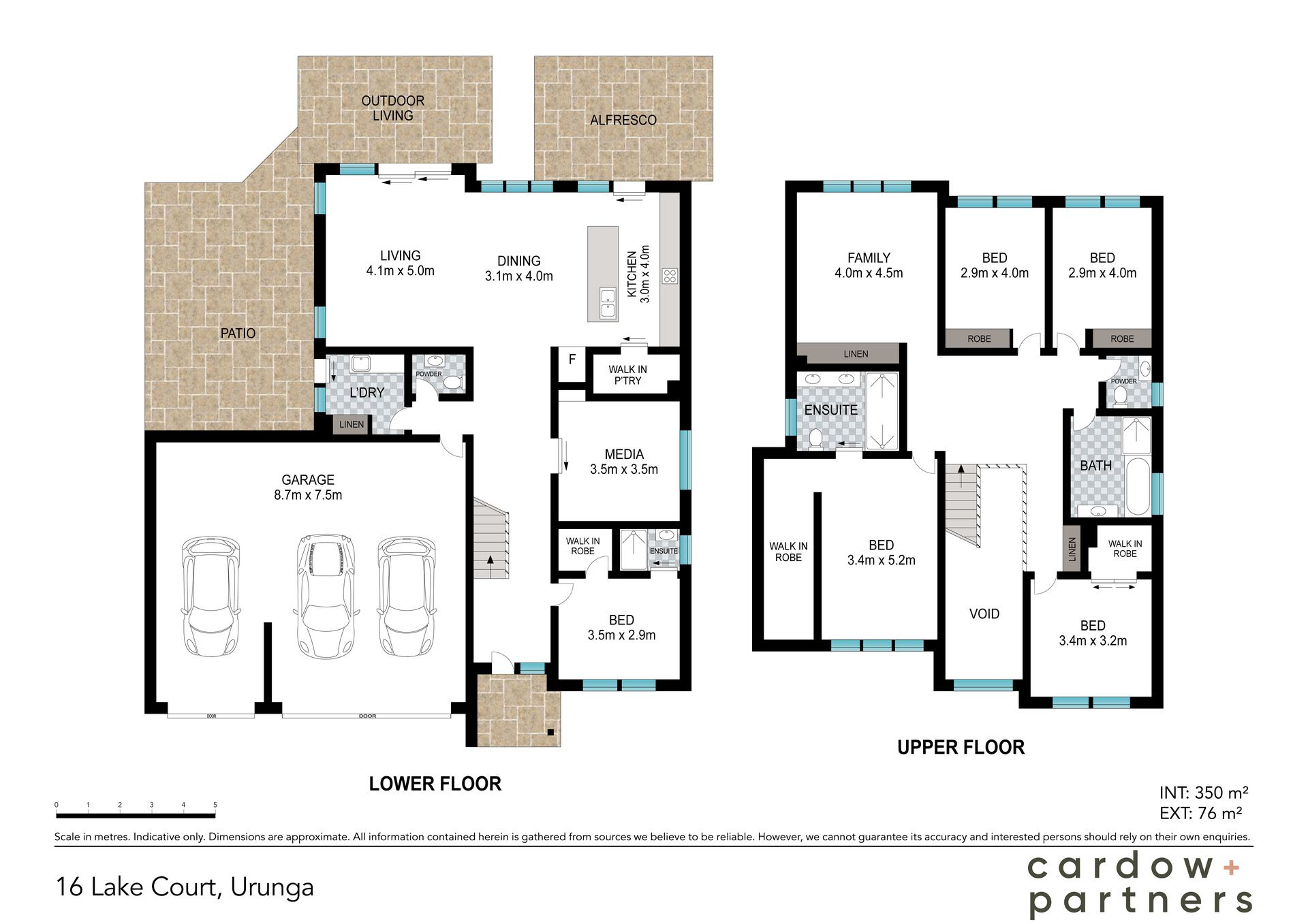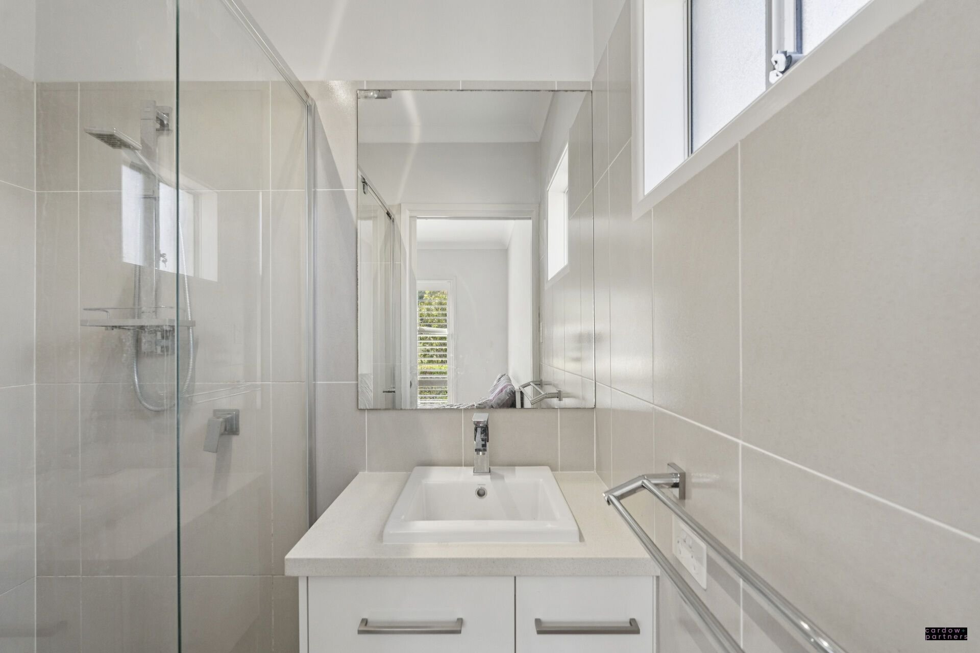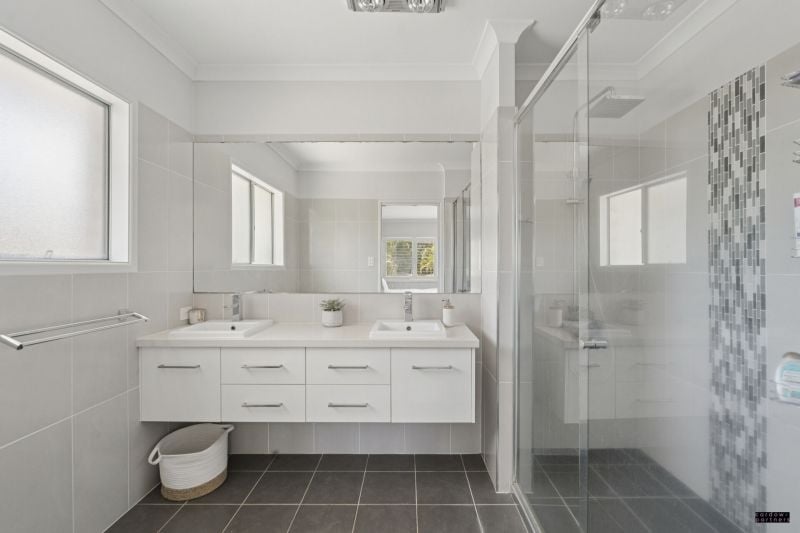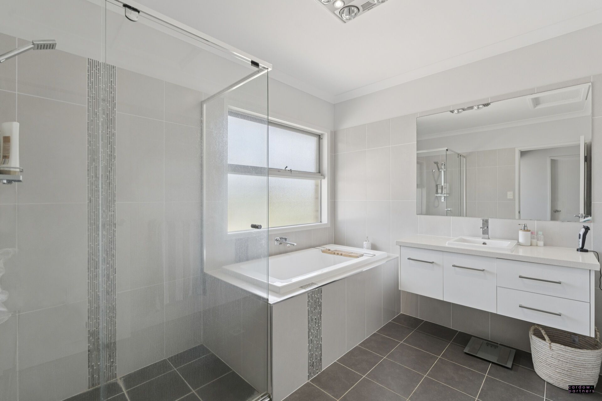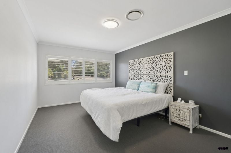 Accommodation is generous, offering five bedrooms plus a media room with built-in robe. The upper-level master suite feels like a private retreat with an expansive walk-in wardrobe, dual basins and a dual-headed shower. On the lower level, a second master bedroom provides flexibility for extended family or guests and includes its own walk-in robe, plantation shutters and ensuite. Remaining bedrooms all offer built-in robes and easy access to the main tiled bathroom and separate w/c.