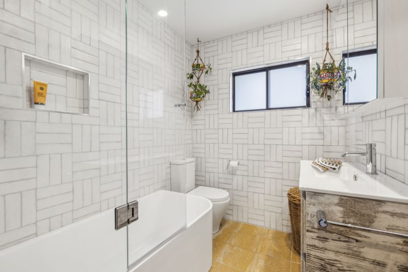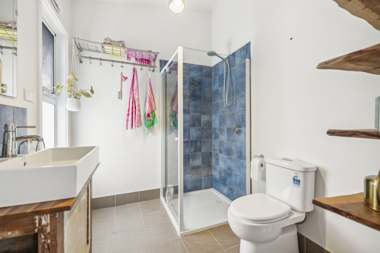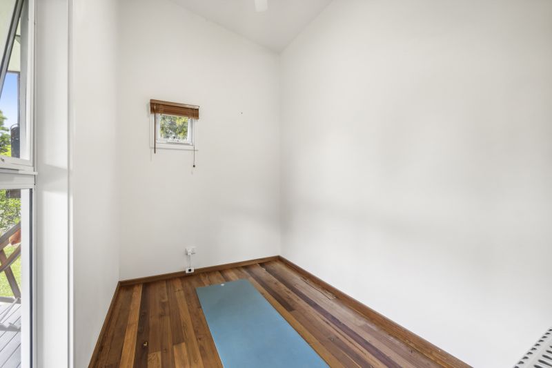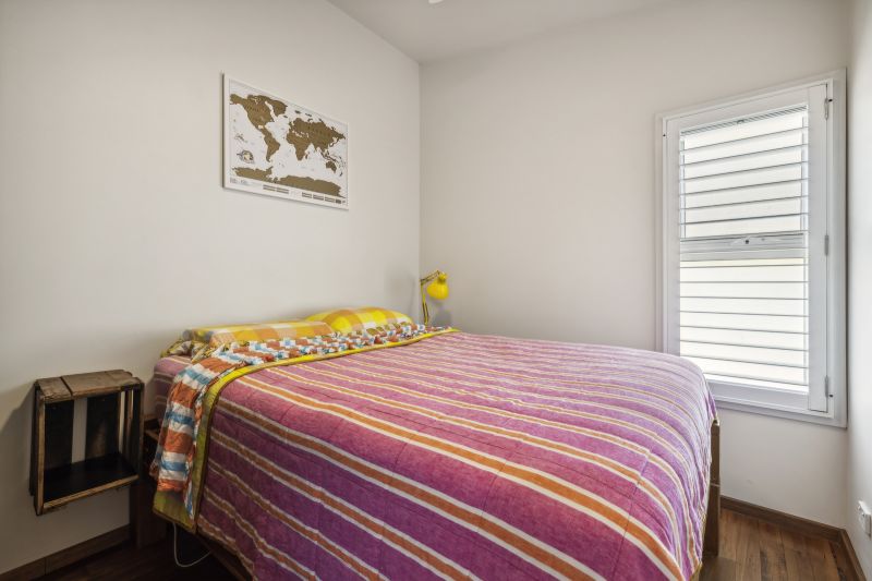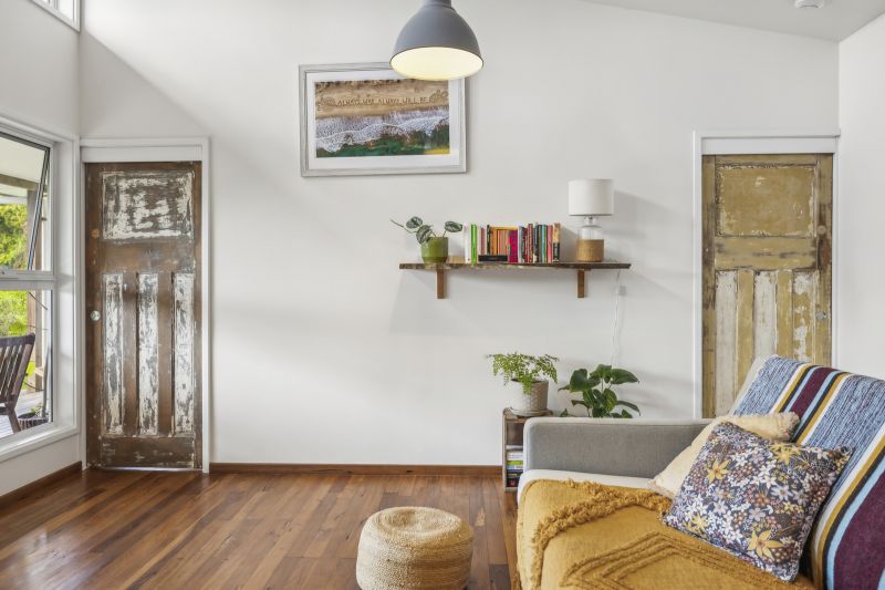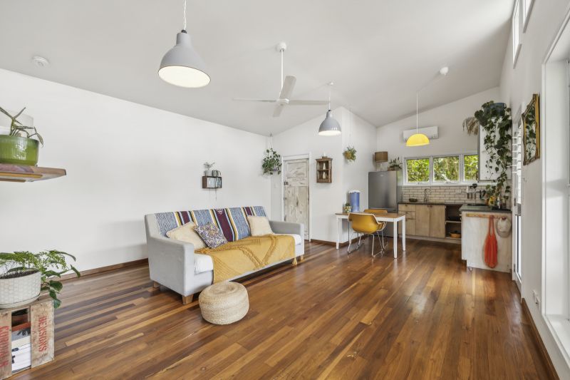 The beach cabin boasts a passive solar design, north-facing windows for ample sunlight, a funky and inviting space with hardwood timber floors, ideal for living in or leasing out. Additionally, there is an outdoor shower for rinsing off after a beach swim.