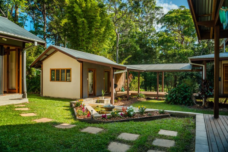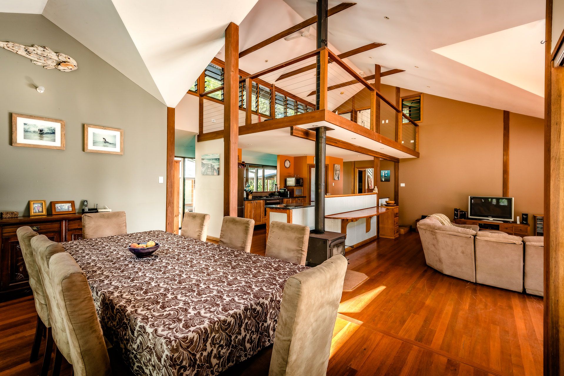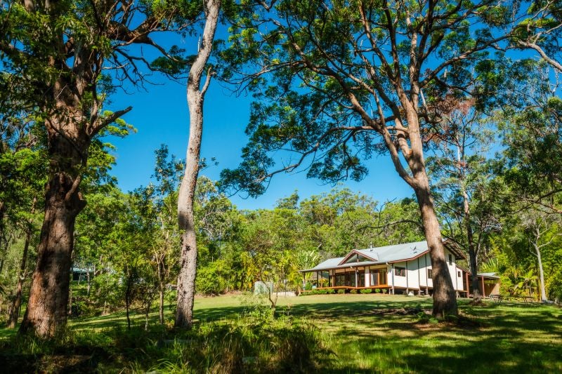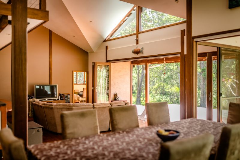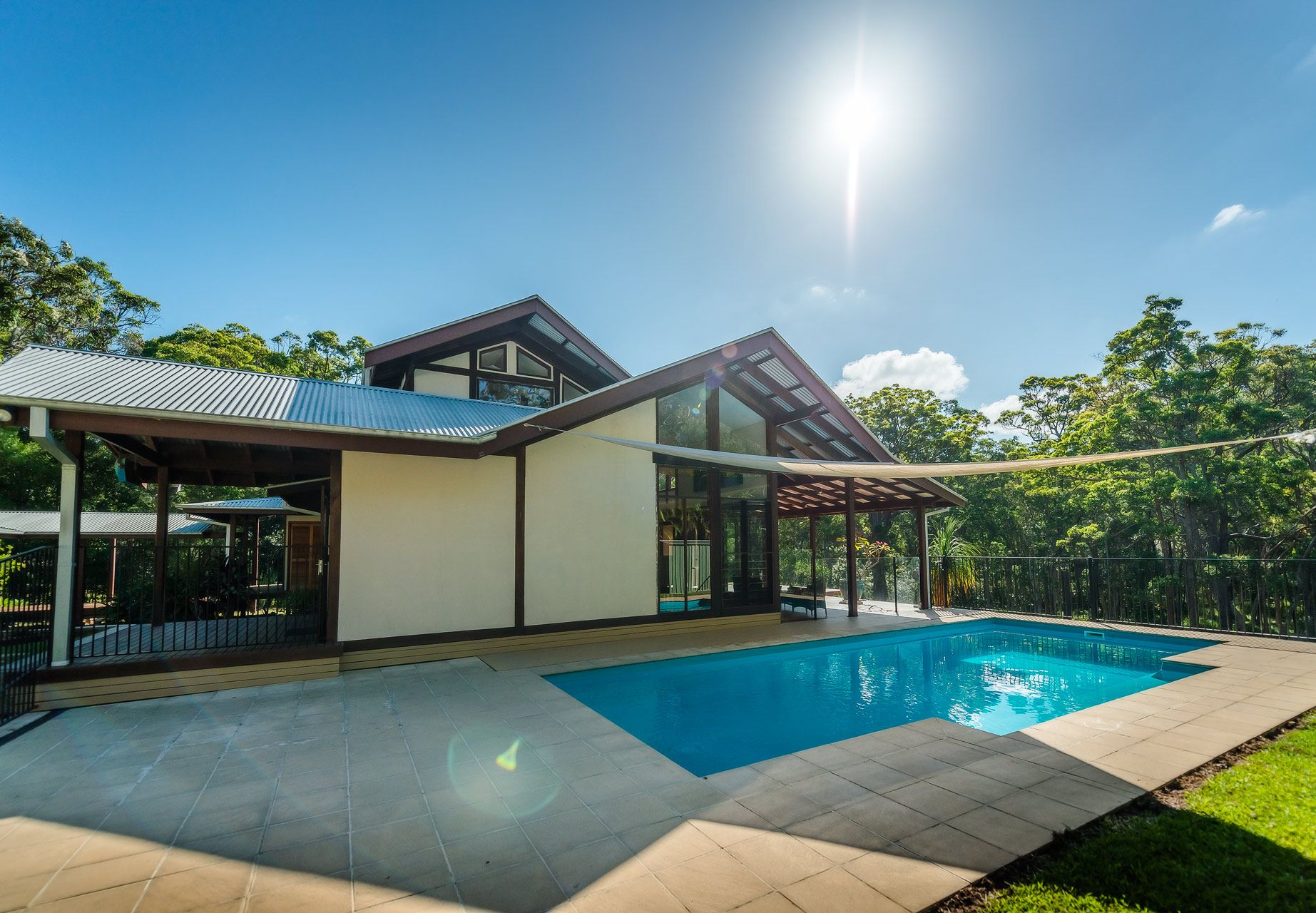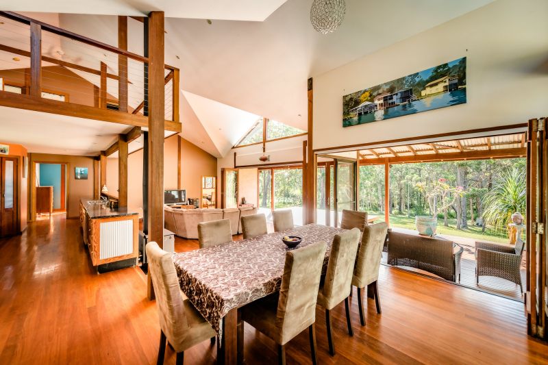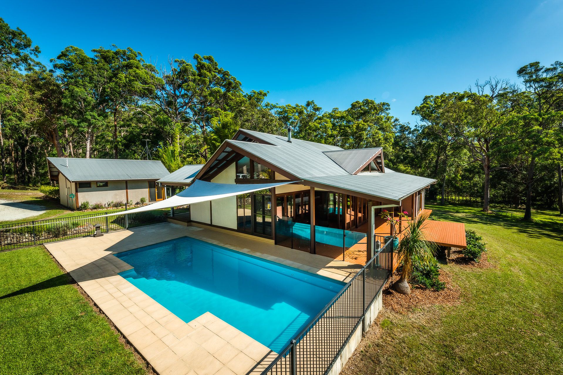 If you're looking for something different then you'll love every aspect of this unique Rosalie Stollery architect design residence. Situated in one the most sought after & exclusive areas for small acreage on the Mid North Coast, this delightful Urunga home is perfectly set on a private 2.8 acre block only 1.4km from the golden sands of Hungry Head Beach. Nestled amid a quiet bush setting with a tranquil leafy outlook, this charming coastal lifestyle property oozes with character. As you enter the home you will be welcomed with warm solid hardwood timber floors, soaring high ceilings, large bi-fold doors and ambient natural light throughout the open plan living area which gently flows onto a large timber outdoor deck, perfect for entertaining. The main residence offers 3 bedrooms plus loft, timber kitchen with gas cook top, cosy wood fireplace & spacious open plan living. Linked by a covered breeze-way is a separate bath house with feature pebble stone tiles, double vanity, shower, spa bath and peaceful leafy surrounds. There is a spacious separate studio which is ideal for guest accommodation or could suit as a parents retreat and offers a walk in robe, ensuite & plenty of room to relax. This impressive family home is designed to take advantage of the sunny northerly aspect and offers a sparkling in-ground salt water pool. Rare opportunity to acquire a unique home in such a location, exceptionally positioned only 3 minutes drive to Hungry Head Beach, 5 minutes to Urunga village shops, 20 minutes from the beautiful historic Bellingen or 20 minutes from the bustling Coffs Harbour & jet airport. To truly appreciate all that it offers an inspection is a must.