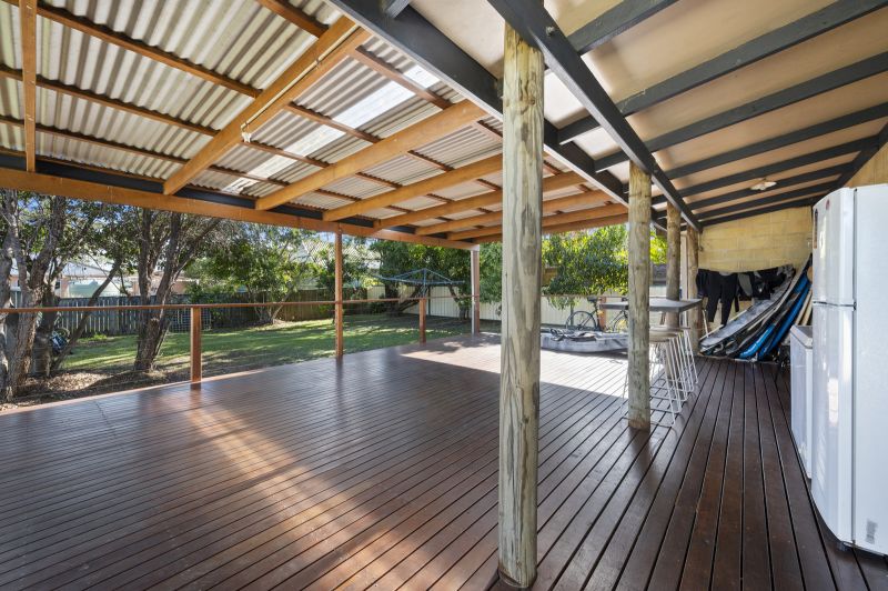 The flat fully fenced rear yard boasts mature trees and plenty of grassed areas for kids and pets, with garden shed and hills hoist clothesline completing the quintessential Australian beachside back yard.