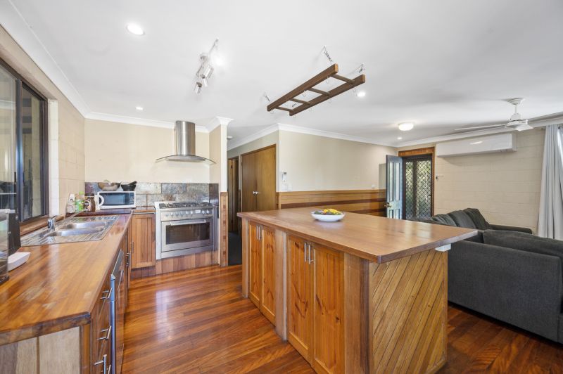 From the street mature trees frame the front of the property, with double colourbond gates should you wish to close and have complete privacy. The home itself is solid block construction, with a welcoming front wooden veranda looking out to the private front yard. Inside the home you will find open plan living, kitchen and dining with air-con, with a rumpus room to the left and 3 bedrooms, a bathroom and laundry to the right. At the rear is the huge covered wooden deck - a second outdoor living area for the warmer months with plenty of room for outdoor dining and entertaining.