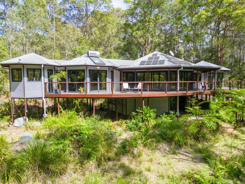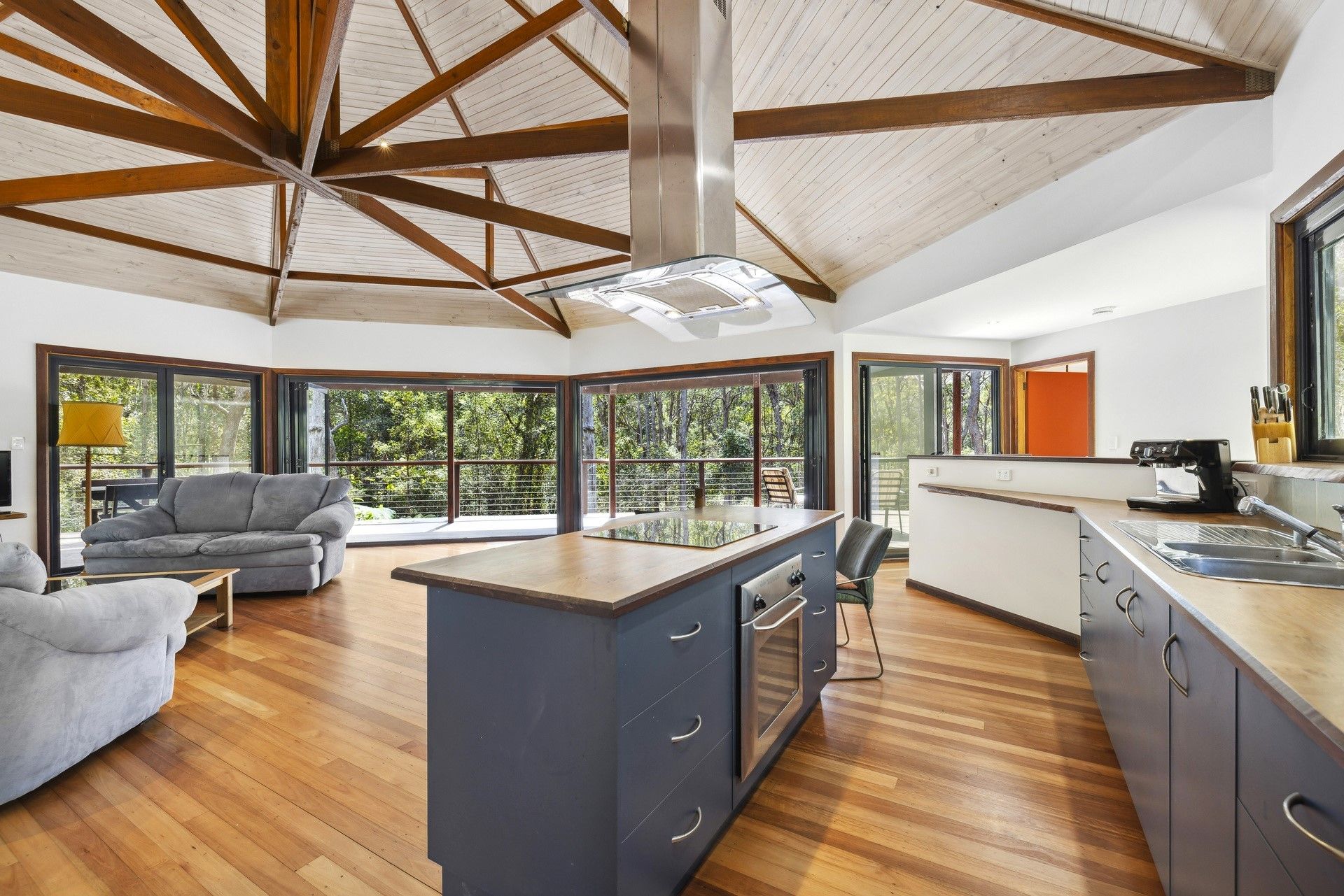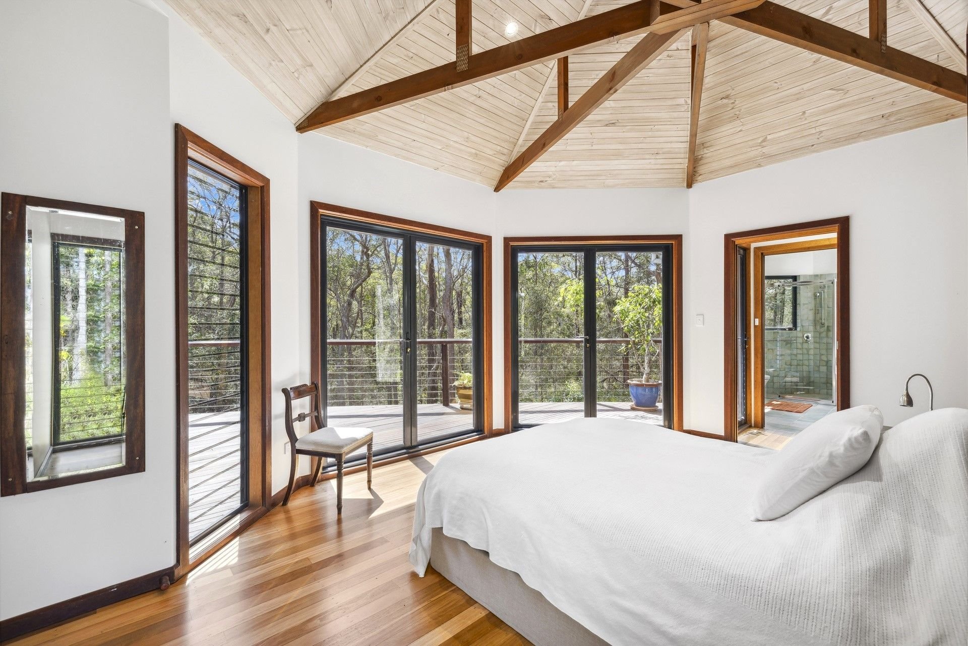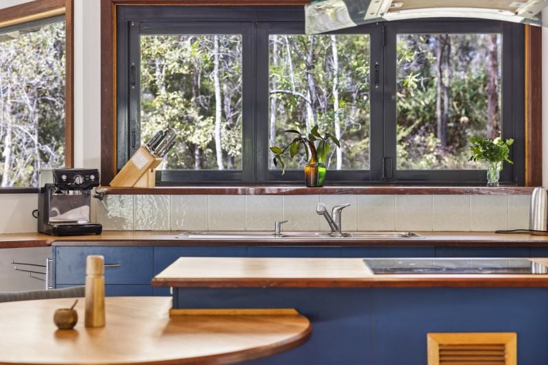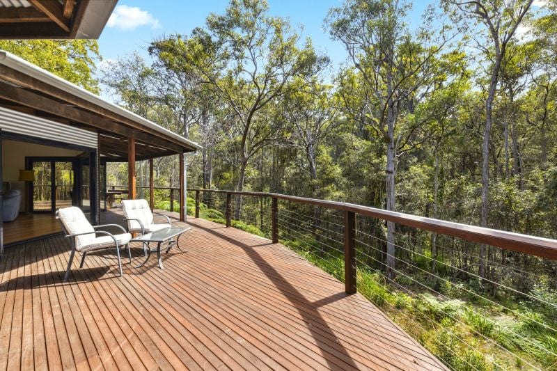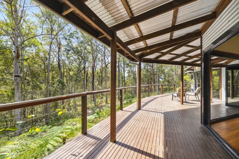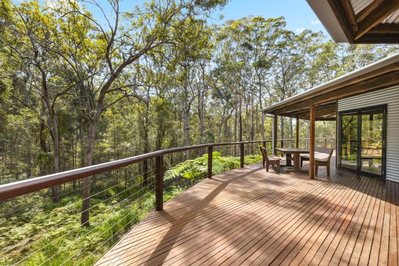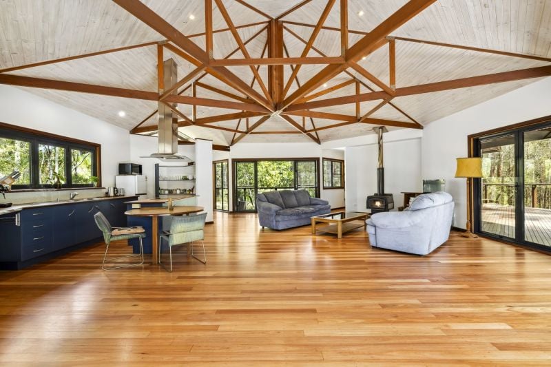 Designed by renowned architect, Rosalie Stollery, the home radiates warm energy with a magnificent timber lined atrium which draws you into the open plan lounge, dining & kitchen area with cozy fireplace. The light-filled room flows freely onto the rear entertaining deck to allow the outdoors in and is the perfect choice for keen wildlife watchers or those wishing for privacy.
