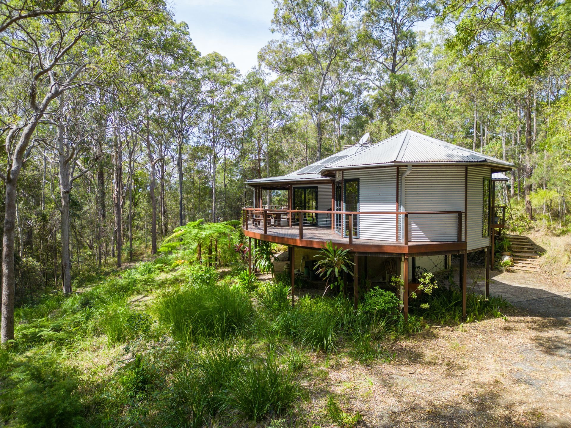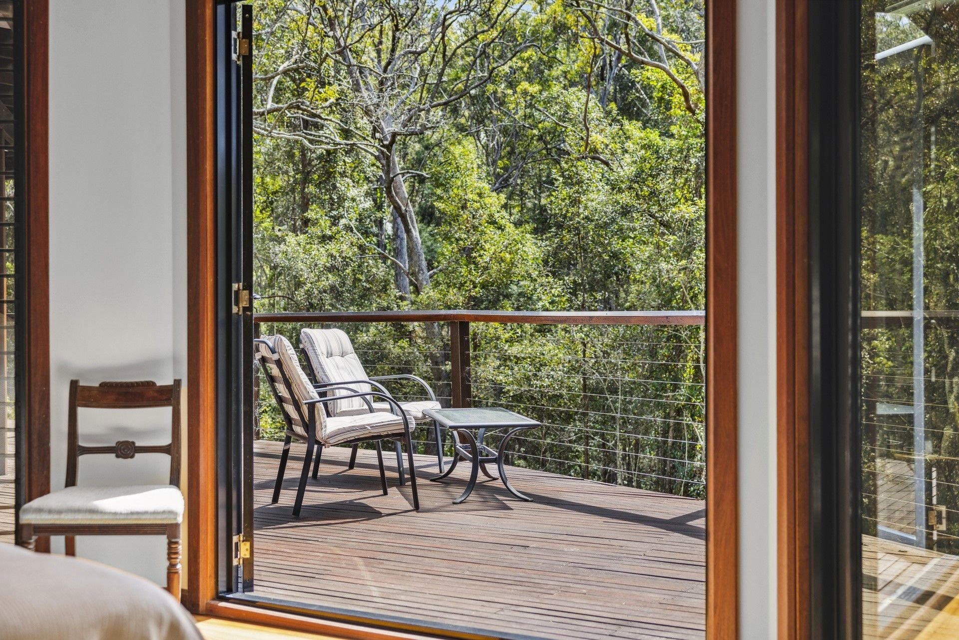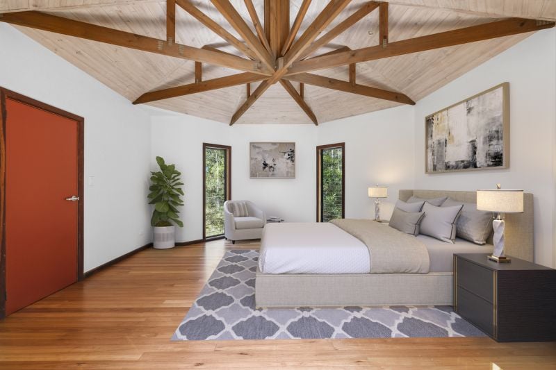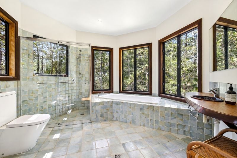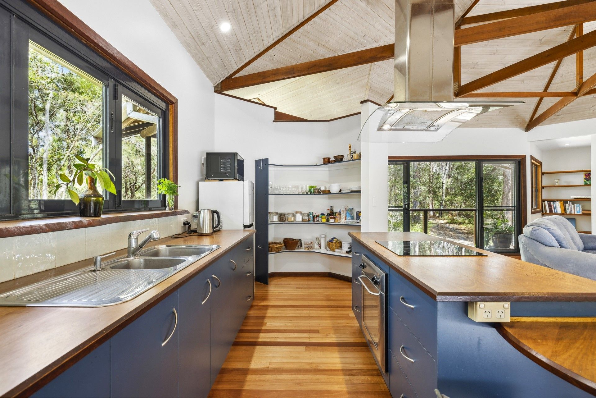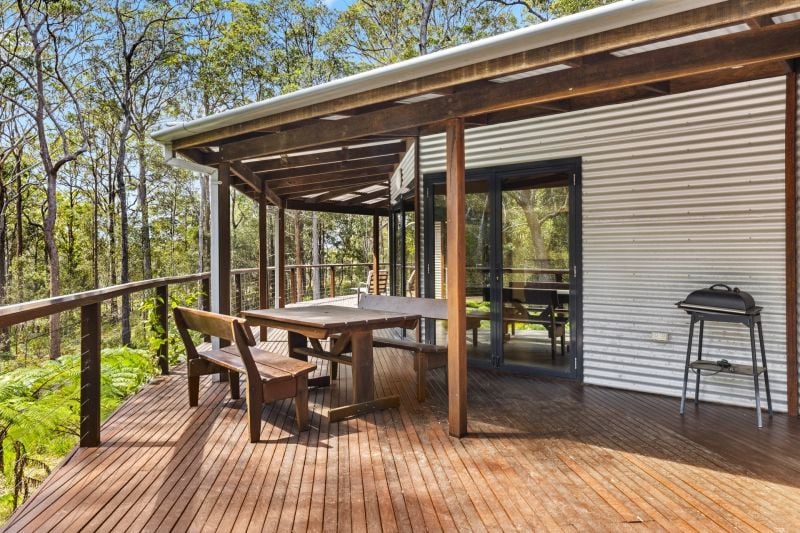 Designed by renowned architect, Rosalie Stollery, the home radiates warm energy with a magnificent timber lined atrium which draws you into the open plan lounge, dining & kitchen area with cozy fireplace. The light-filled room flows freely onto the rear entertaining deck to allow the outdoors in and is the perfect choice for keen wildlife watchers or those wishing for privacy.
