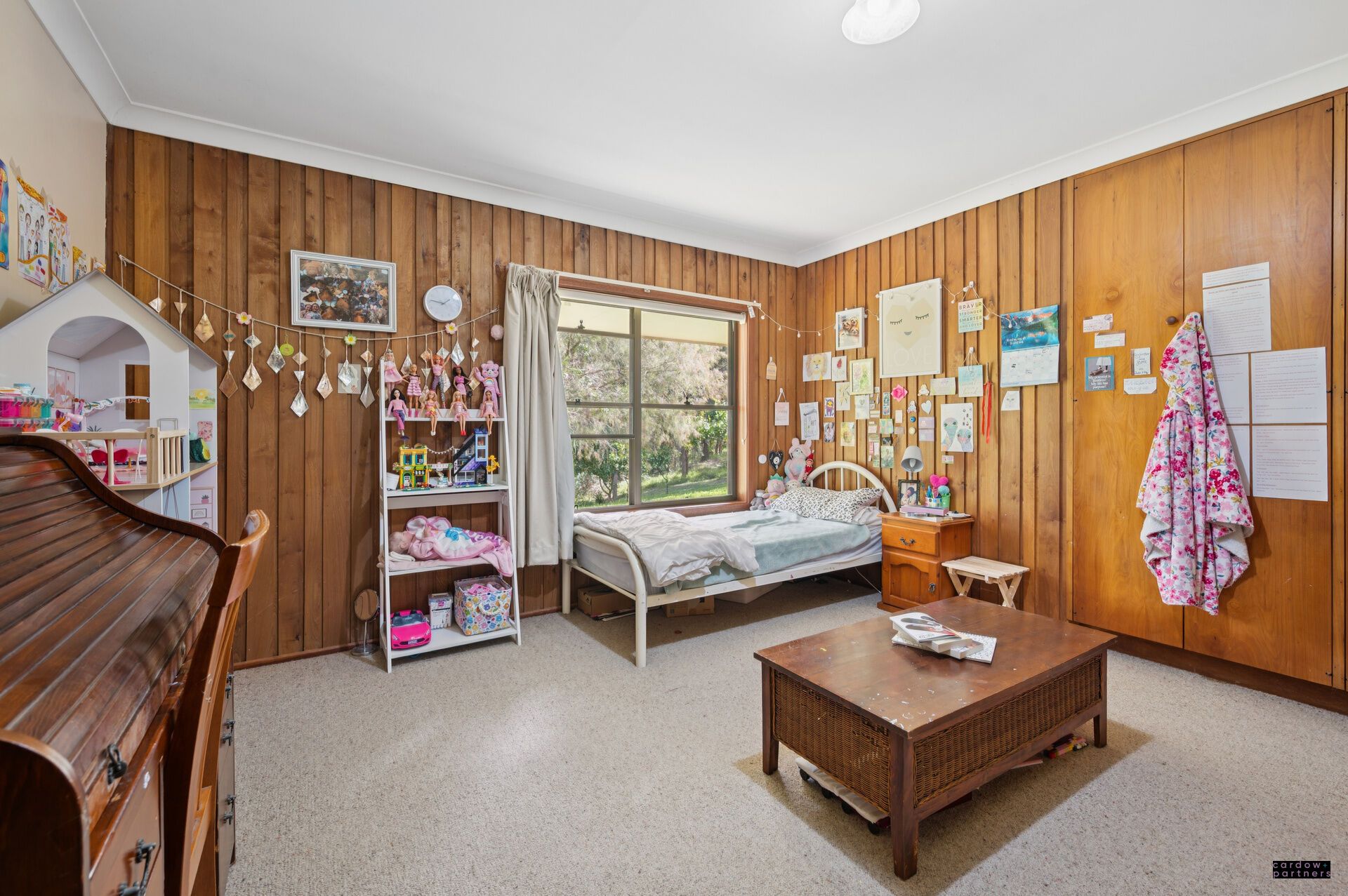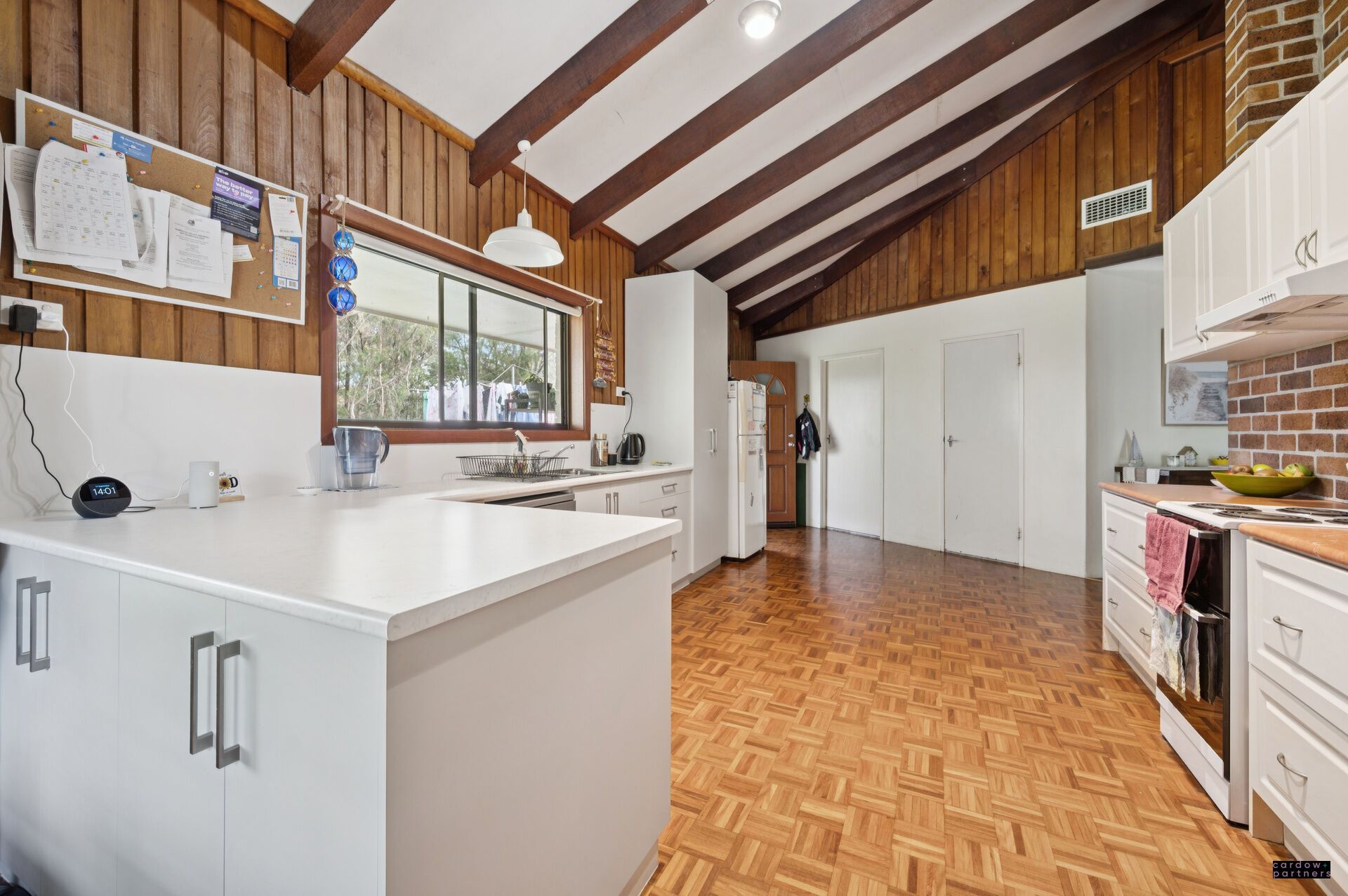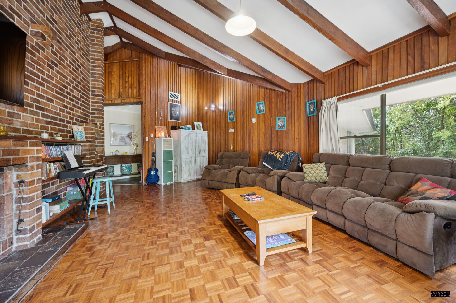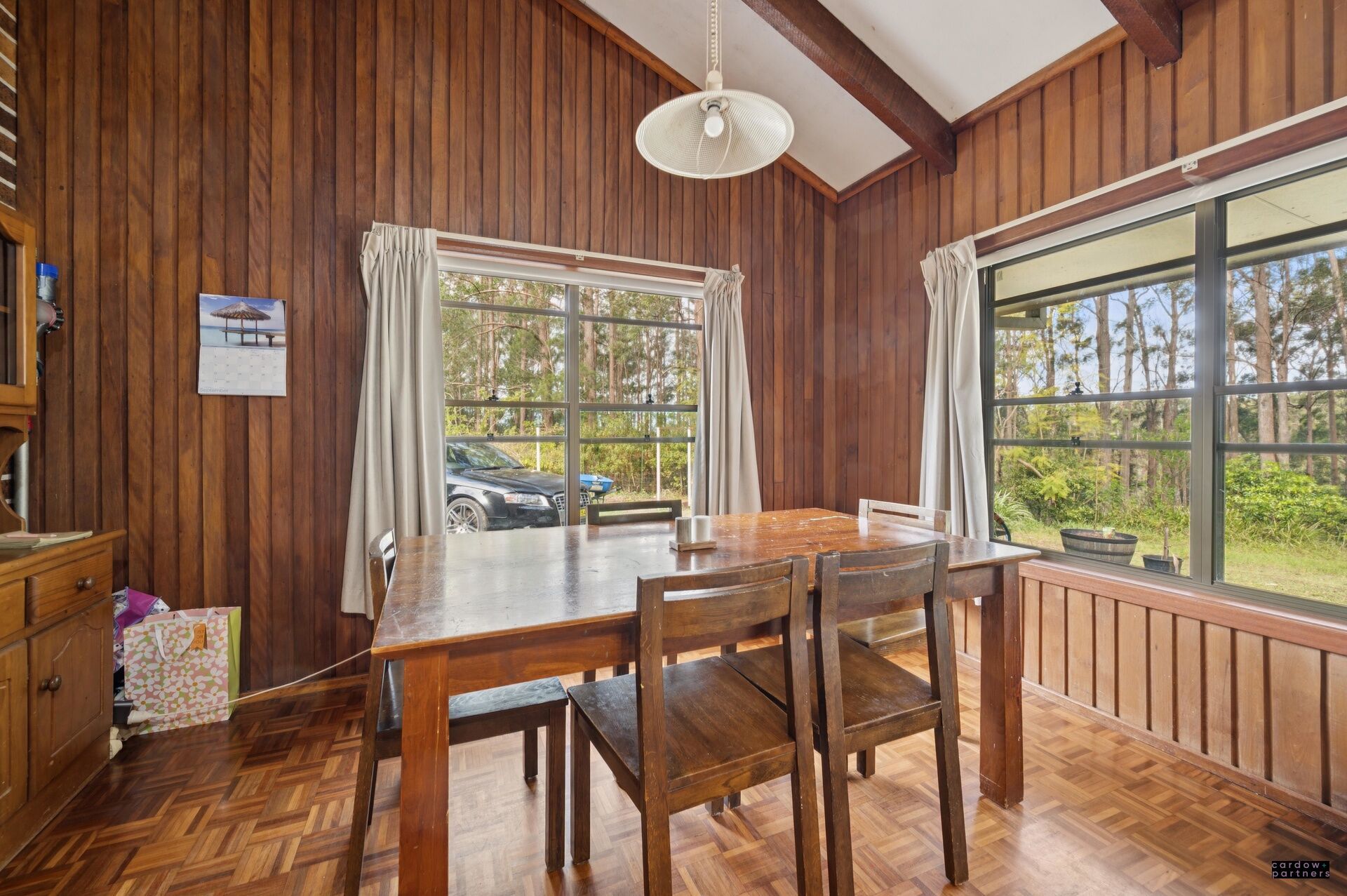 Originally built in 1978-79, the home is a testament to craftsmanship and character. Much of the hardwood used in its construction was milled from the property itself, giving it a rare authenticity and timeless appeal. With features such as cathedral ceilings, parquetry and slate flooring, and a lounge with a cosy open fireplace, the home radiates warmth and rustic charm.