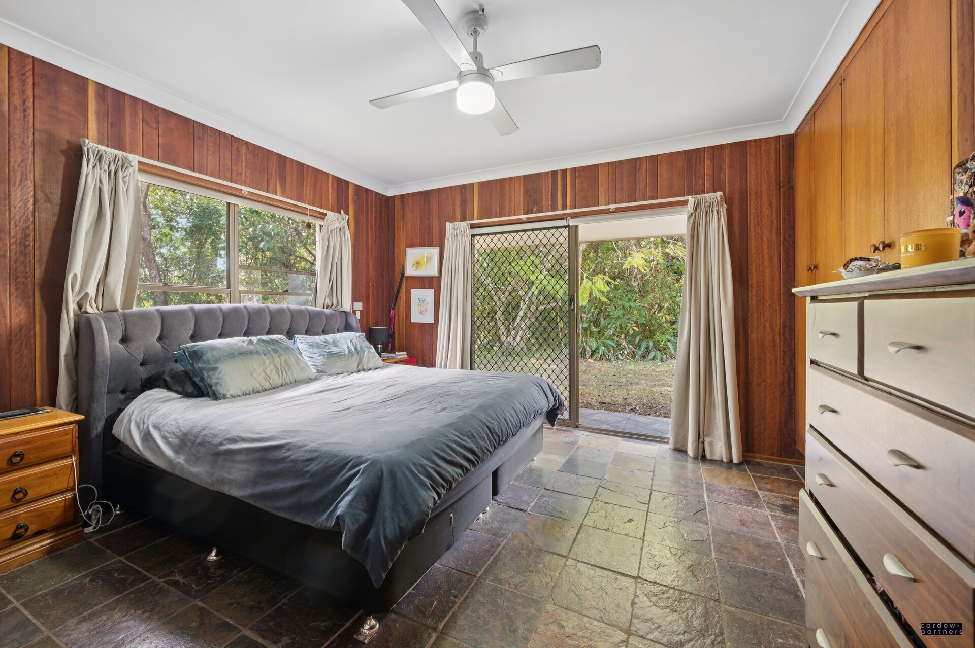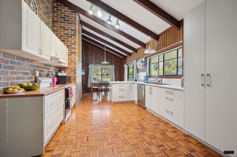 The interiors showcase beautiful native timbers, including Flooded Gum, Brushbox, Rosewood, and Coachwood, creating a one-of-a-kind residence with natural textures and lasting strength. Accommodation comprises four bedrooms with built-in robes, serviced by a tiled bathroom and separate W/C. A functional kitchen with walk-in pantry adjoins the dining and living spaces, making it a practical base for family life.