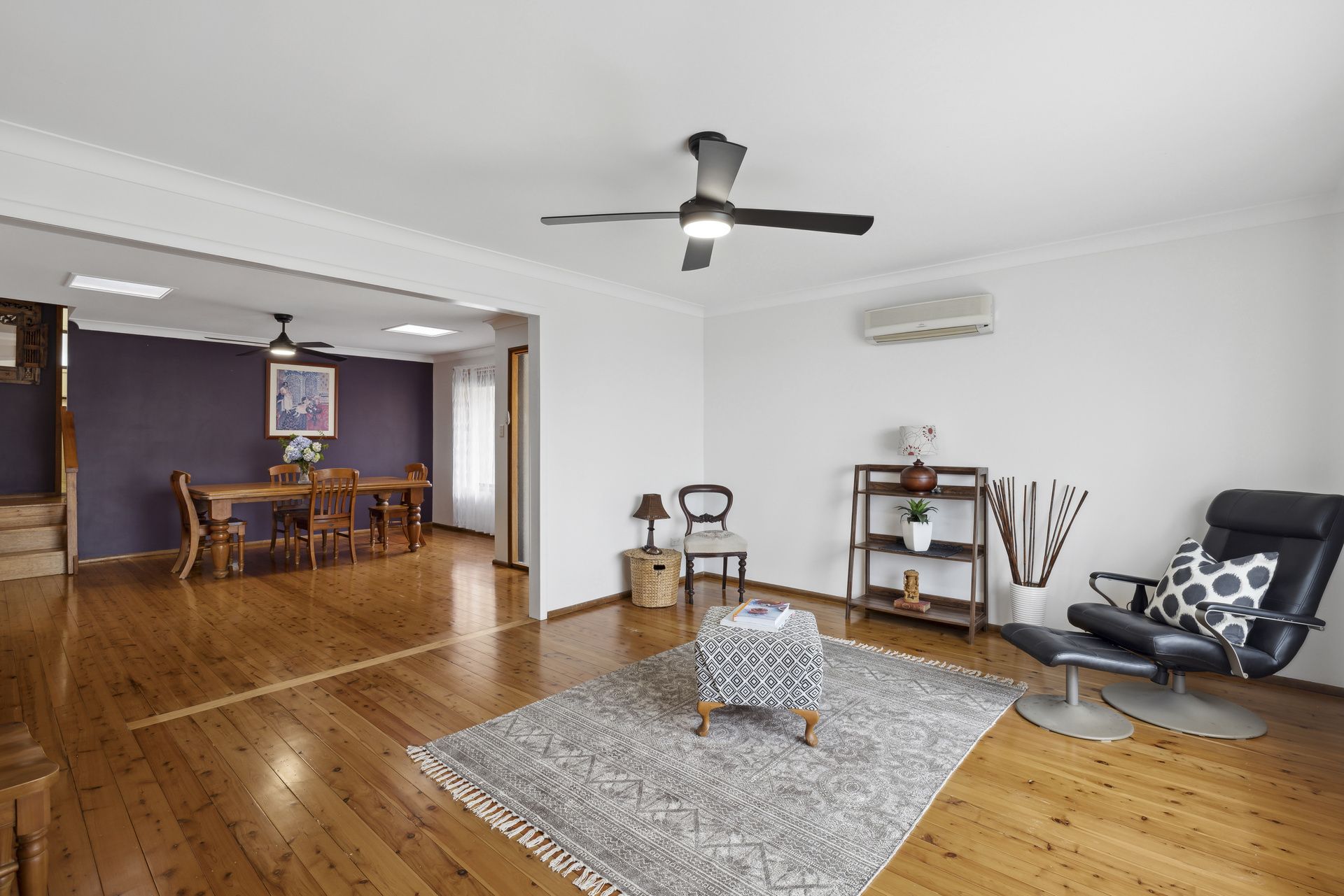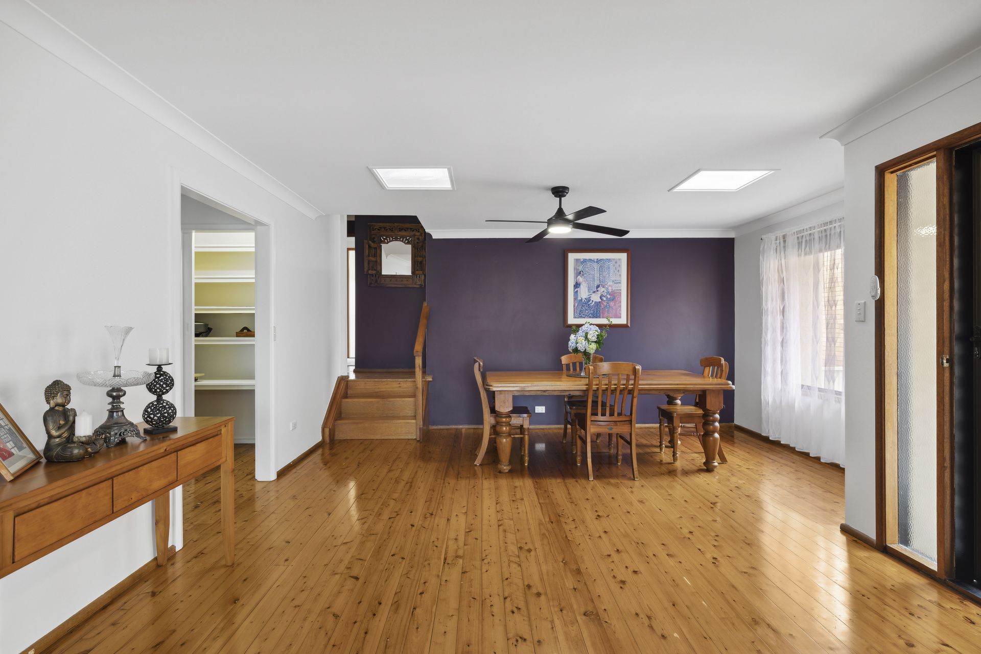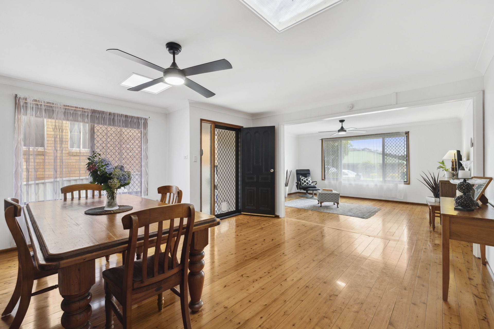 Upstairs, the home boasts three large bedrooms, each equipped with built-in robes and new LED ceiling fans. Two of the bedrooms also offer expansive sleepouts, perfect as a children's playroom, study nook, or dressing area. The open-plan lounge and dining areas flow seamlessly into the modern kitchen, complete with polished timber floors throughout.