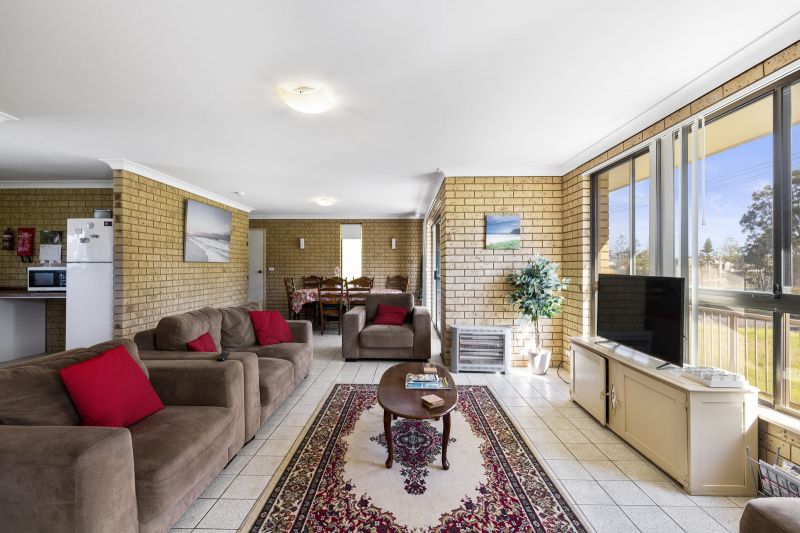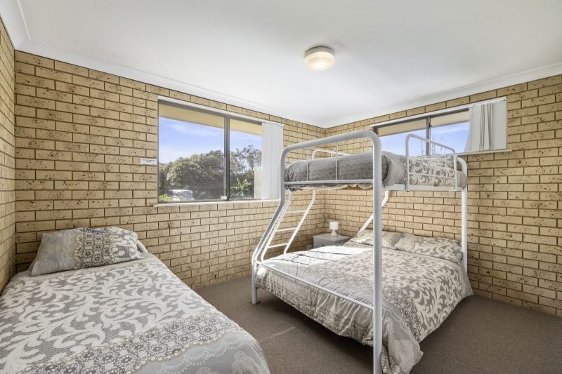 The large living area has a flat screen tv & four-seater lounge with ottoman. To the right of the main living area this another small living area with a fold out sofa bed. The kitchen has everything you need to be able to create your own meals on your holiday, with electric cooking appliances. The western end of the unit has one bedroom with two single beds. The eastern end of the unit consists of the main bedroom that has a queen bed, second bedroom with tri bunk & single bed & large bathroom with separate toilet.