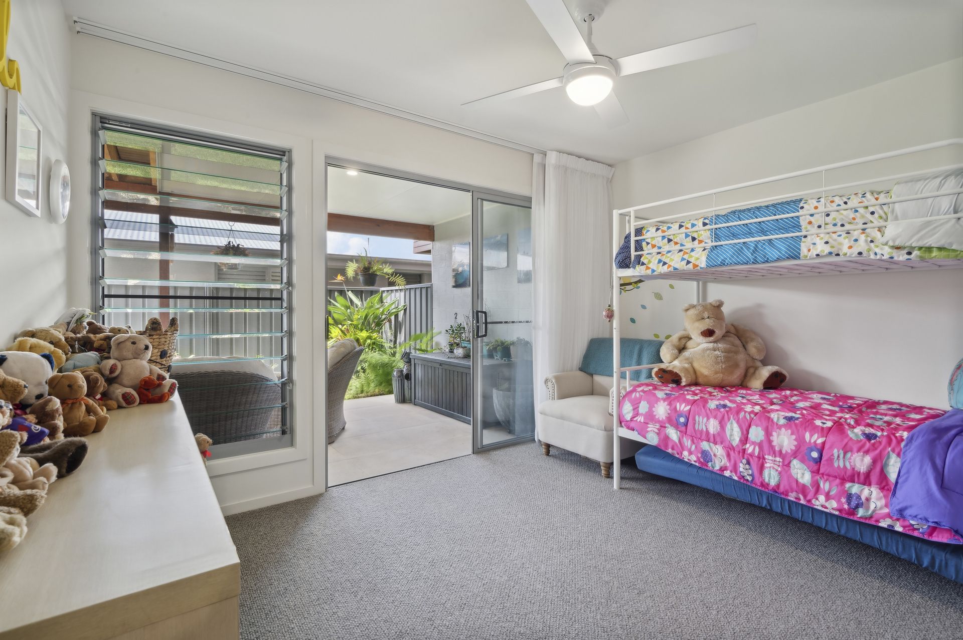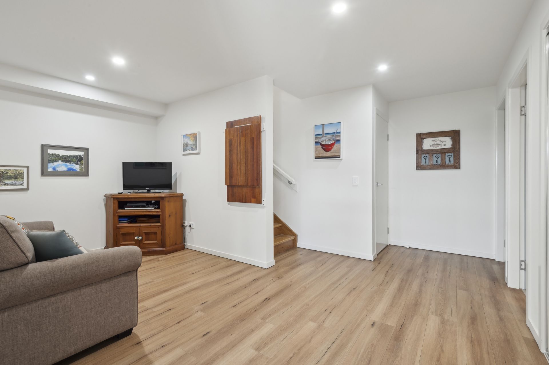 Downstairs, guests are well accommodated with two generous bedrooms, both with ceiling fans, along with a versatile rumpus room-perfect as a second living space or potential fourth bedroom. A tiled main bathroom with a separate toilet adds convenience, while the additional terrace offers a peaceful space to enjoy the easy-care lawns and gardens.