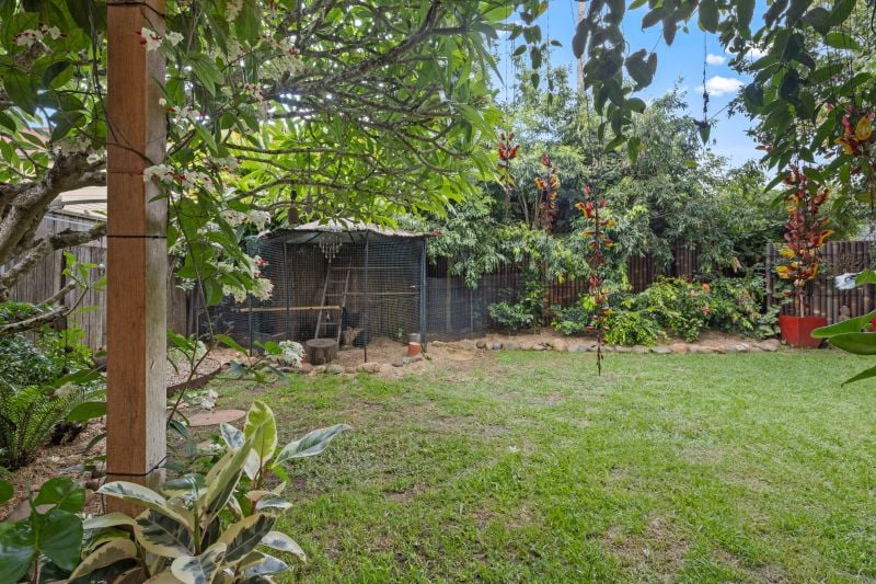Step outside to a private, north-facing garden, framed by lush landscaping, a manicured lawn, and a charming chicken hutch. It's a peaceful oasis, ideal for entertaining, relaxing, or simply enjoying nature in complete privacy. The property also includes a fully fenced yard and a single remote garage, adding to the convenience.