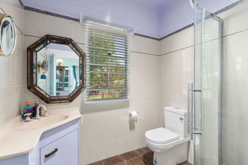 The bathroom is tiled and there is a shower and a toilet. There is also a second toilet off the laundry for convenience.