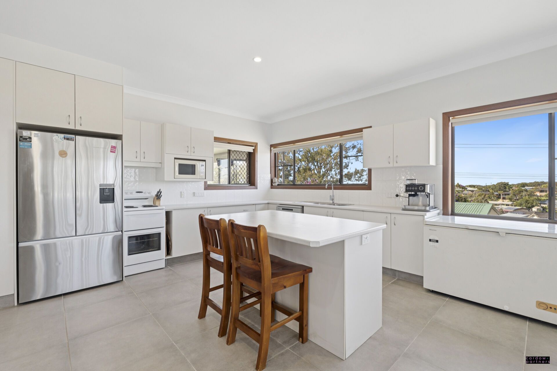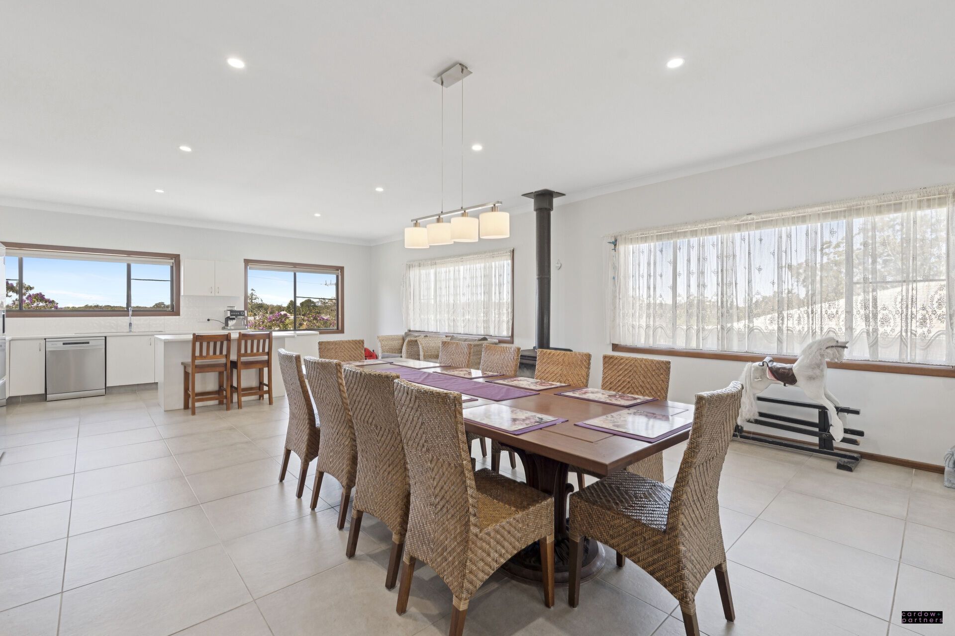 Upstairs features three generous bedrooms, each complete with built-in robes and ceiling fans, serviced by a modern tiled bathroom and separate W/C. The high ceilings and open plan design create a light-filled living, dining, and kitchen zone, complete with reverse cycle air-conditioning, wood heater, and a stylish kitchen boasting an island benchtop, dishwasher, and electric cooking. From here, step out to the rear covered balcony, the ideal spot to unwind and take in the peaceful surrounds.