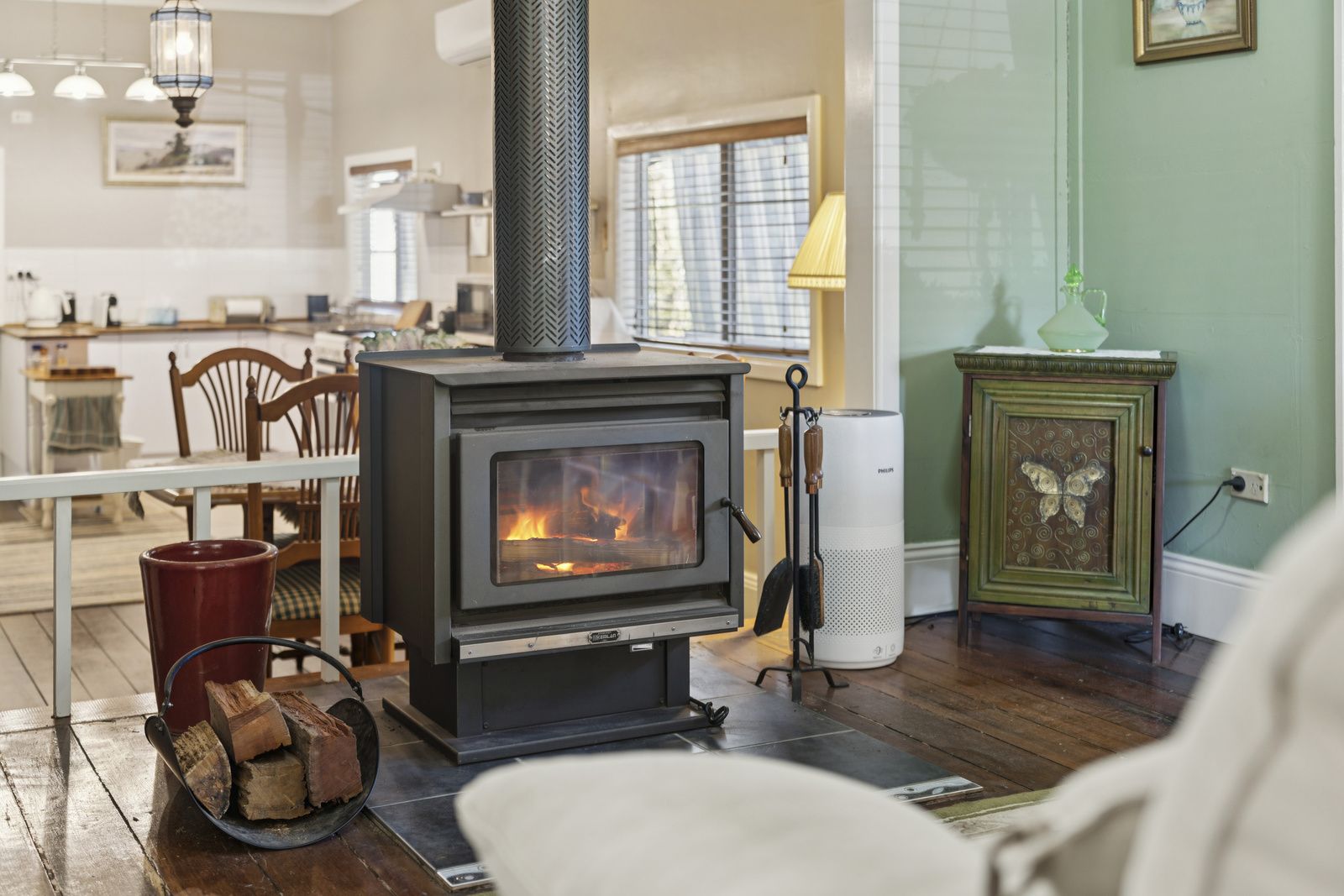 Lounge with slow-combustion wood heater and air conditioning