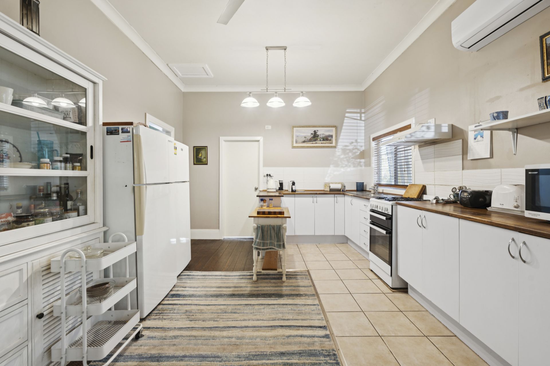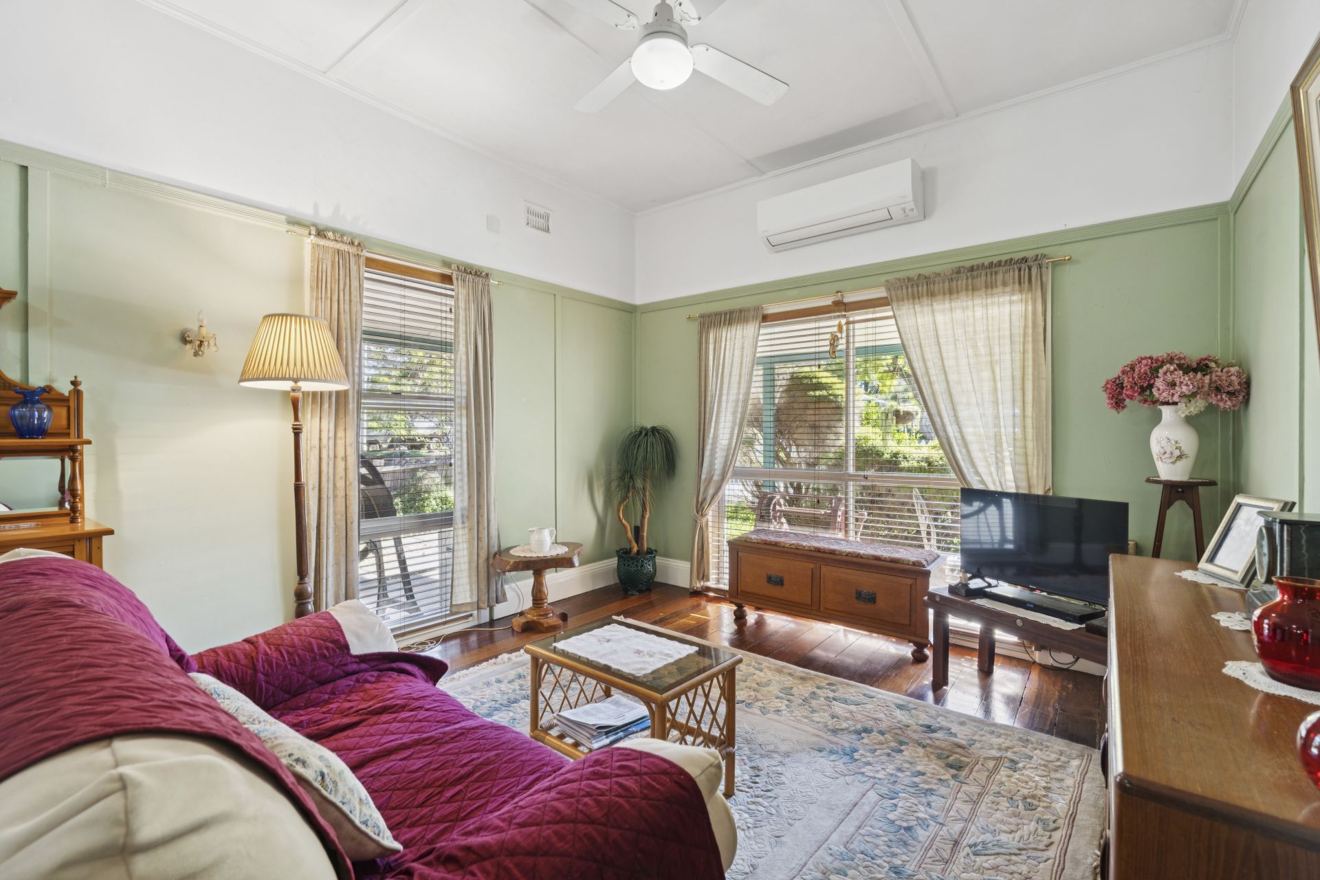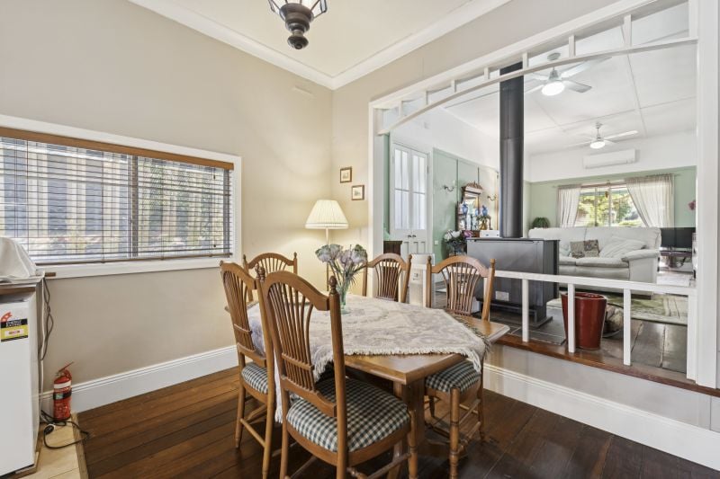Inside, timeless period features shine through: wide timber floorboards, high ceilings, and a flowing, functional layout designed for comfort and flexibility. The home includes three generous bedrooms, a sunroom filled with natural light, a cosy lounge with both a slow-combustion wood heater and air conditioning, plus an open-plan kitchen and dining area that invites connection and entertaining.