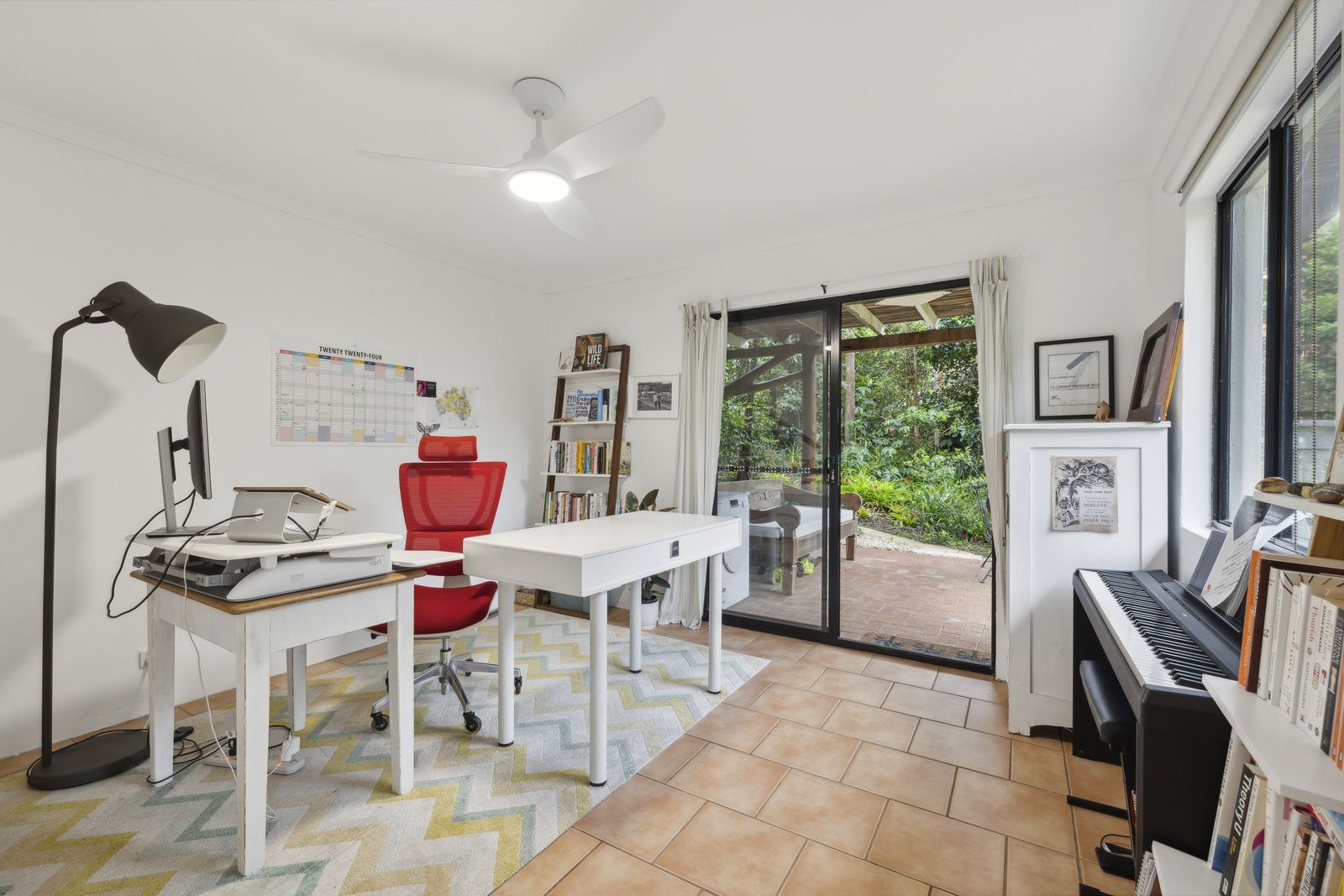 The lower level offers two additional bedrooms and a covered patio that opens directly into a tranquil garden sanctuary. Surrounded by vibrant flowers and lush greenery, this peaceful space is ideal for relaxing or enjoying time with family.