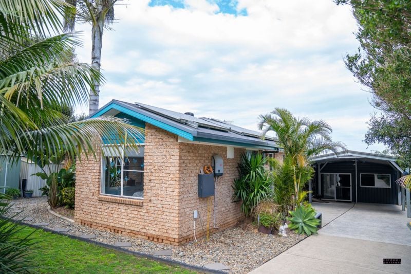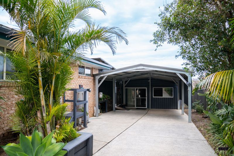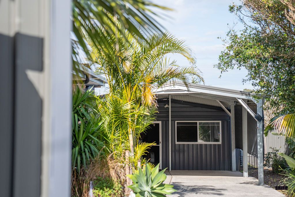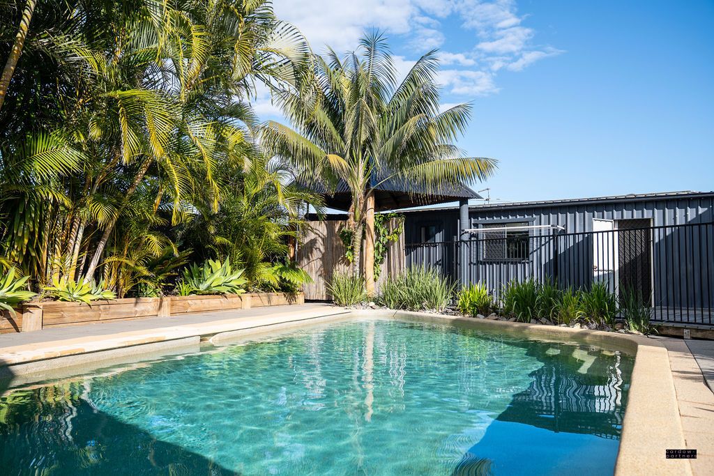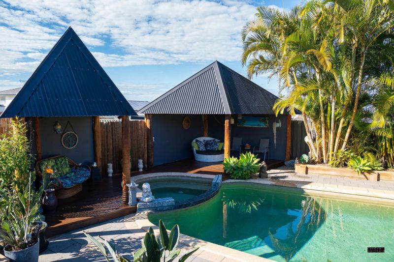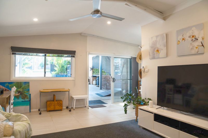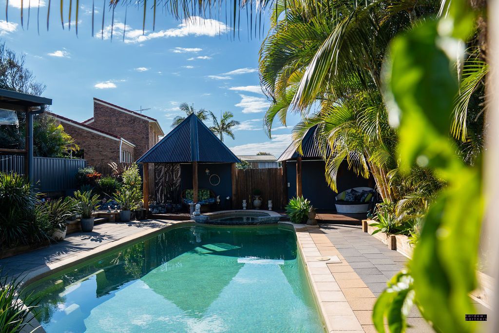 A tropical oasis has been built in the heart of Corindi Beach, on a large 843.2m2 (approx.) block with sparkling swimming pool with spa, well maintained two bedroom brick & tile home, large studio/office accom (partially approved) and fully fenced and private yard with auto sliding gate. You'll feel like you have stepped into a 5-star resort with established tropical gardens, gazebos with room for your daybed for poolside lounging, and an very generous elevated entertaining verandah overlooking the pool and spa.