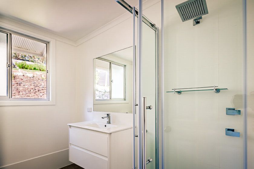 The huge main bedroom (9m x 3.5m) is upstairs and takes advantage of the views through the treetops. There is a walk-in robe and ensuite with rain shower and toilet. There are glass sliding doors that lead to a north-facing balcony, which also offers direct access to the garage via a walkway. This room could also be used as a home office as it has direct access from the street if you have clients calling to the house. Or potential air bnb income.