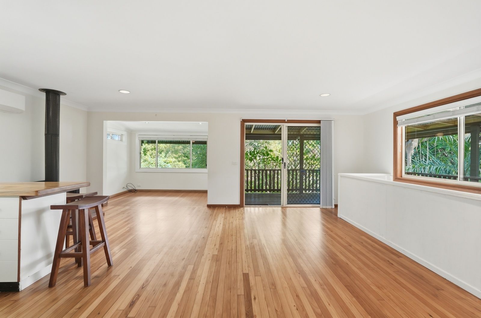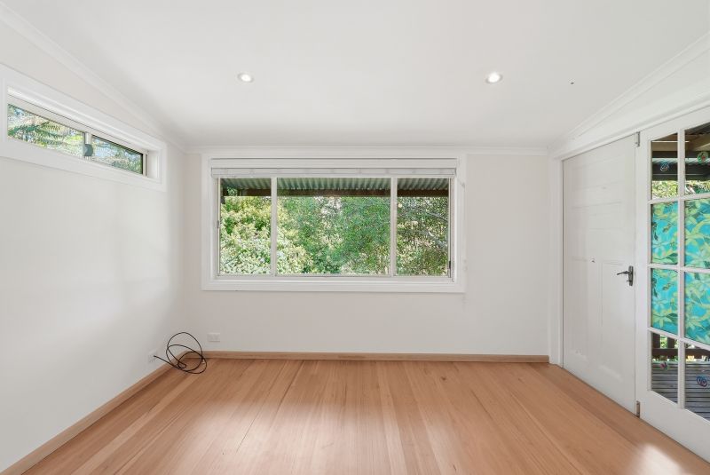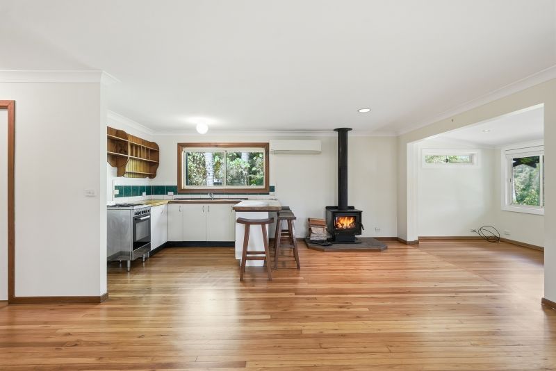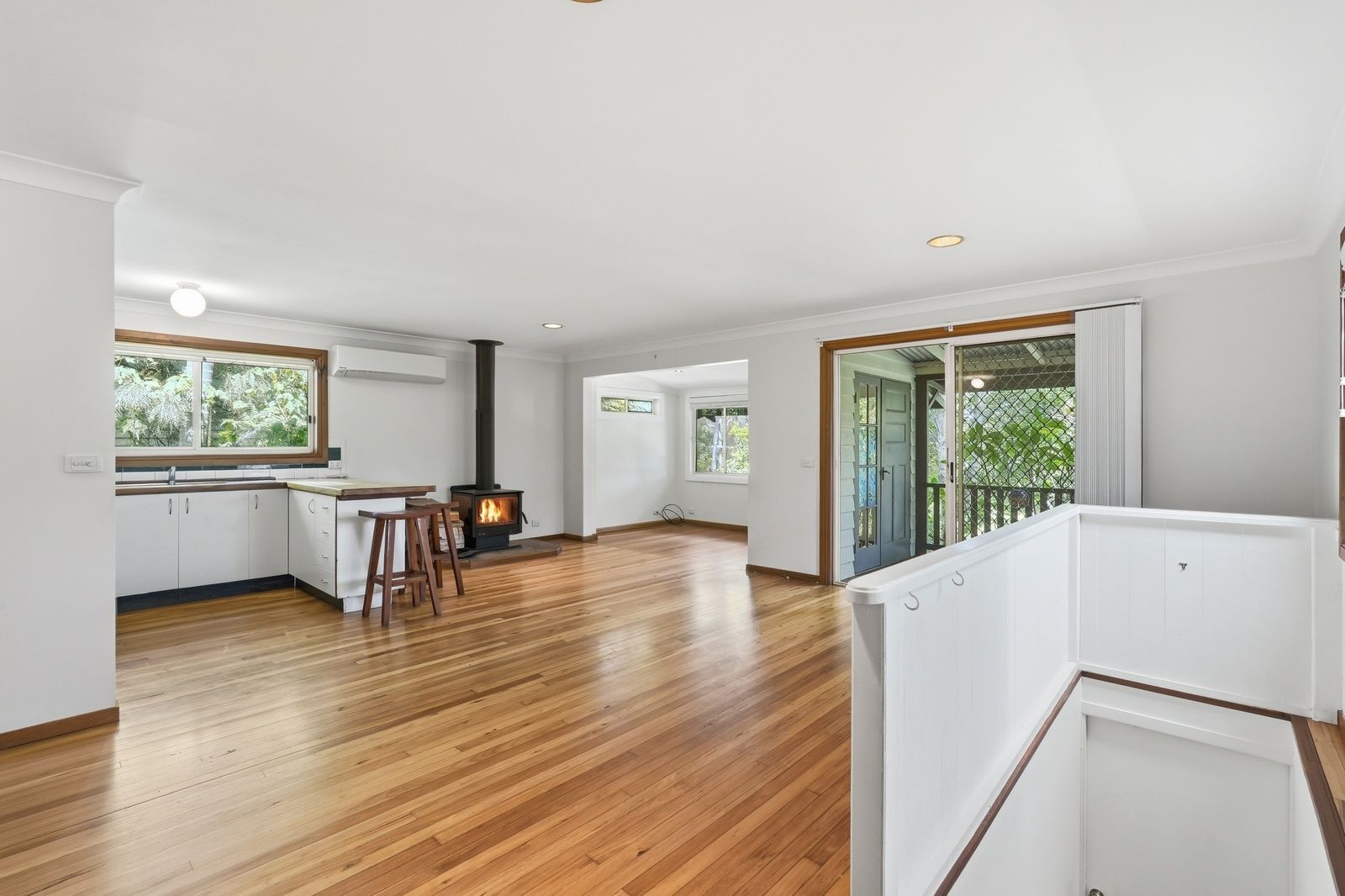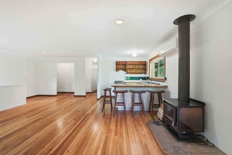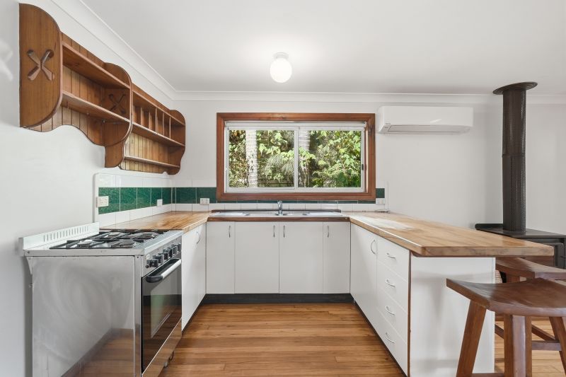 Upstairs features three bedrooms and one bathroom, with warm hardwood timber floors throughout. The neat and functional kitchen includes a hardwood timber benchtop and gas cooking, flowing into the open-plan living area. From here, step out onto the covered timber deck - a lovely private space to relax while enjoying a glimpse of the surrounding mountains.