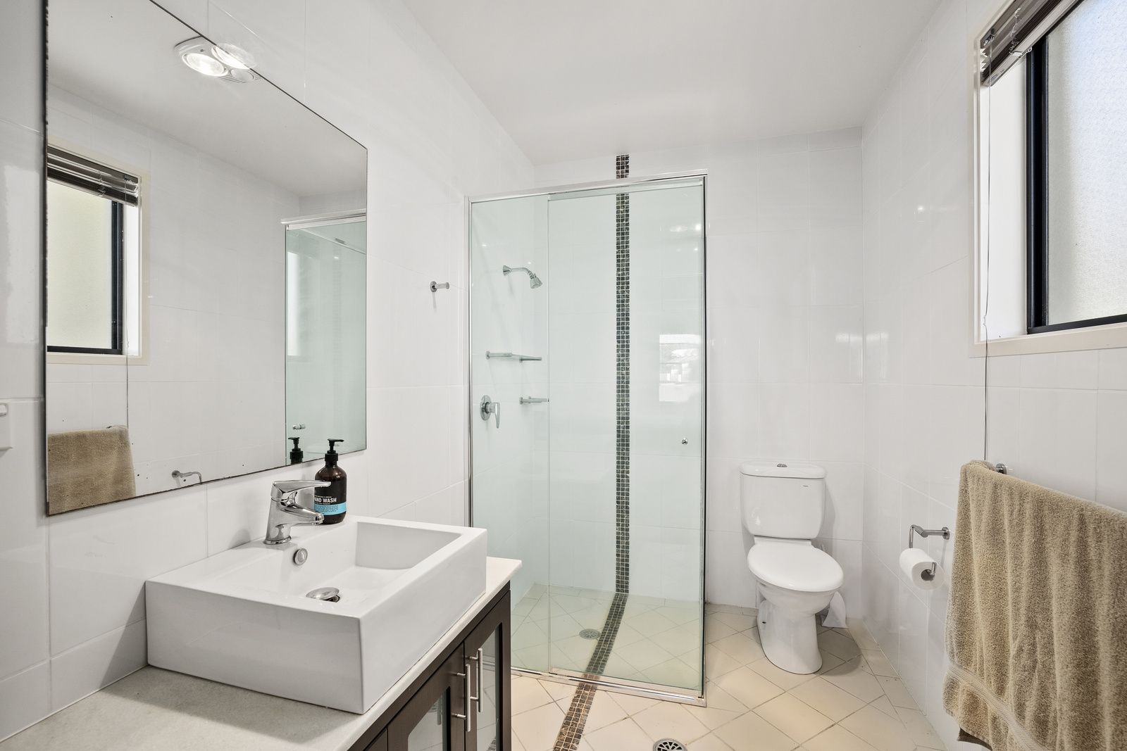 Modern spacious main bathroom with spa style bath is well appointed in the home.