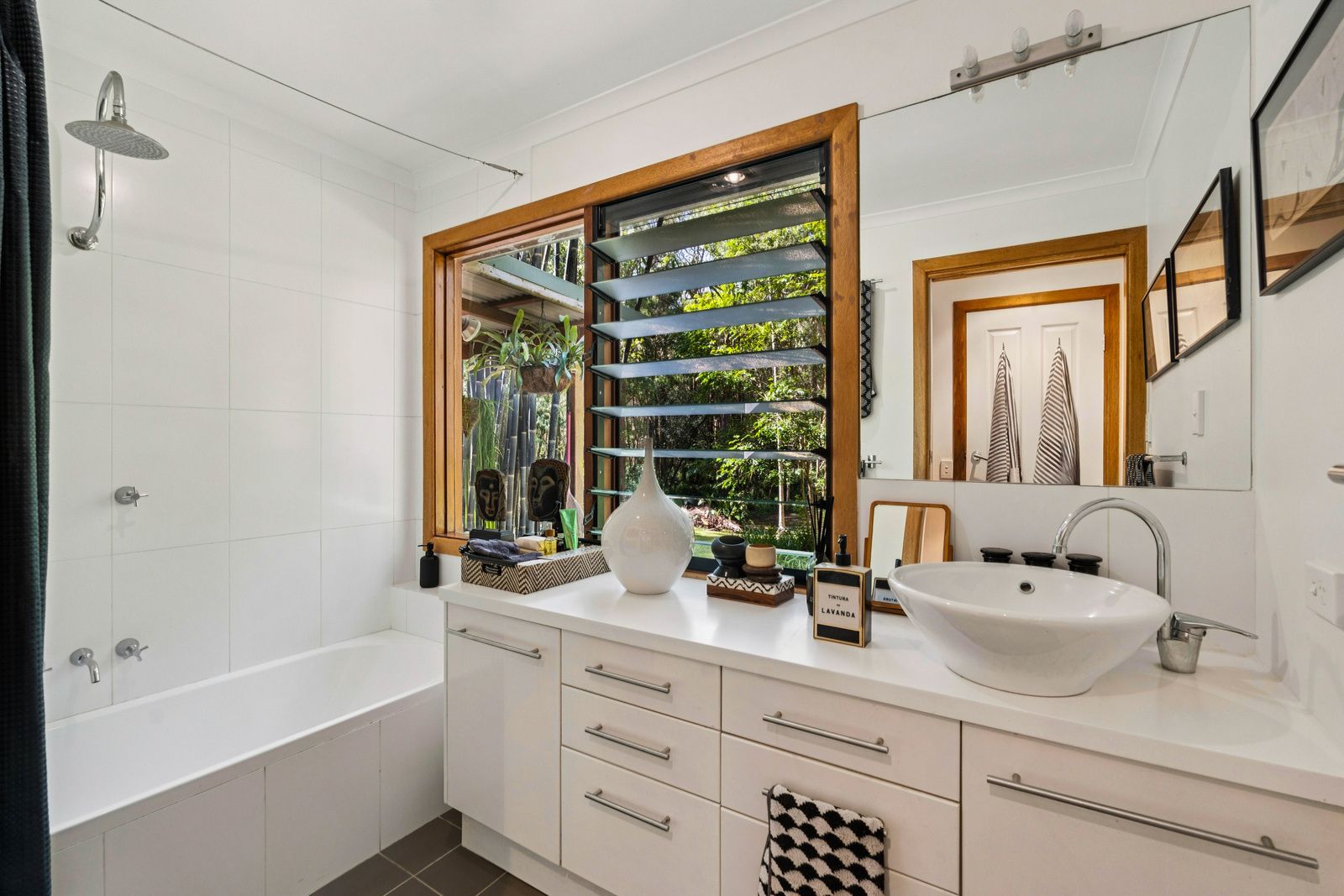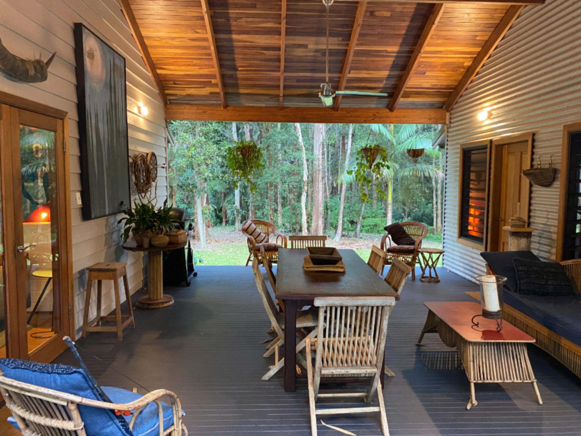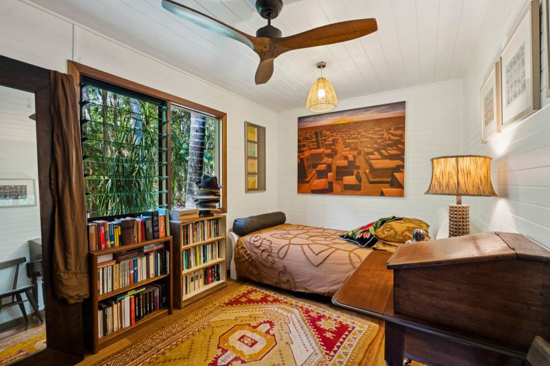 Outside, tropical gardens wrap around the home, offering quiet corners to unwind and enjoy the sounds of nature. There are three lock-up garages, outdoor hot/cold shower, ceiling fans throughout, and a wood shed for practicality.