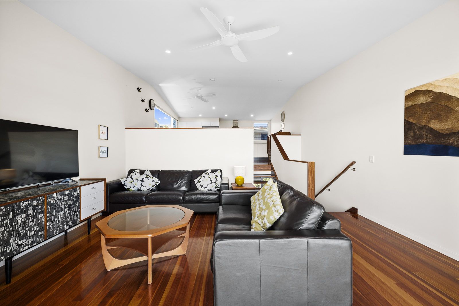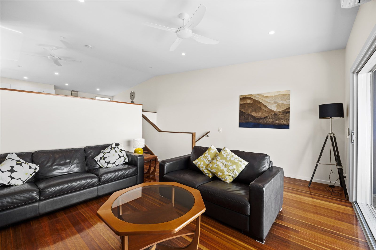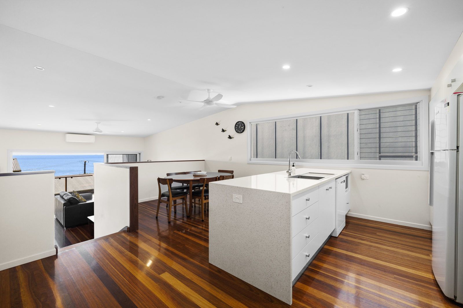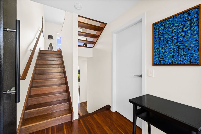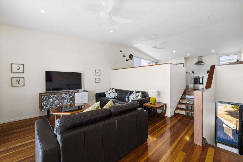 On the ground level you will find one bedroom with two single beds, ceiling fan & built-in robe. Following the few steps down to the lower level of the house you will find the main bedrooms which offers a queen bed, ceiling fan & built-in robe. On this level is also the laundry & spacious bathroom.
