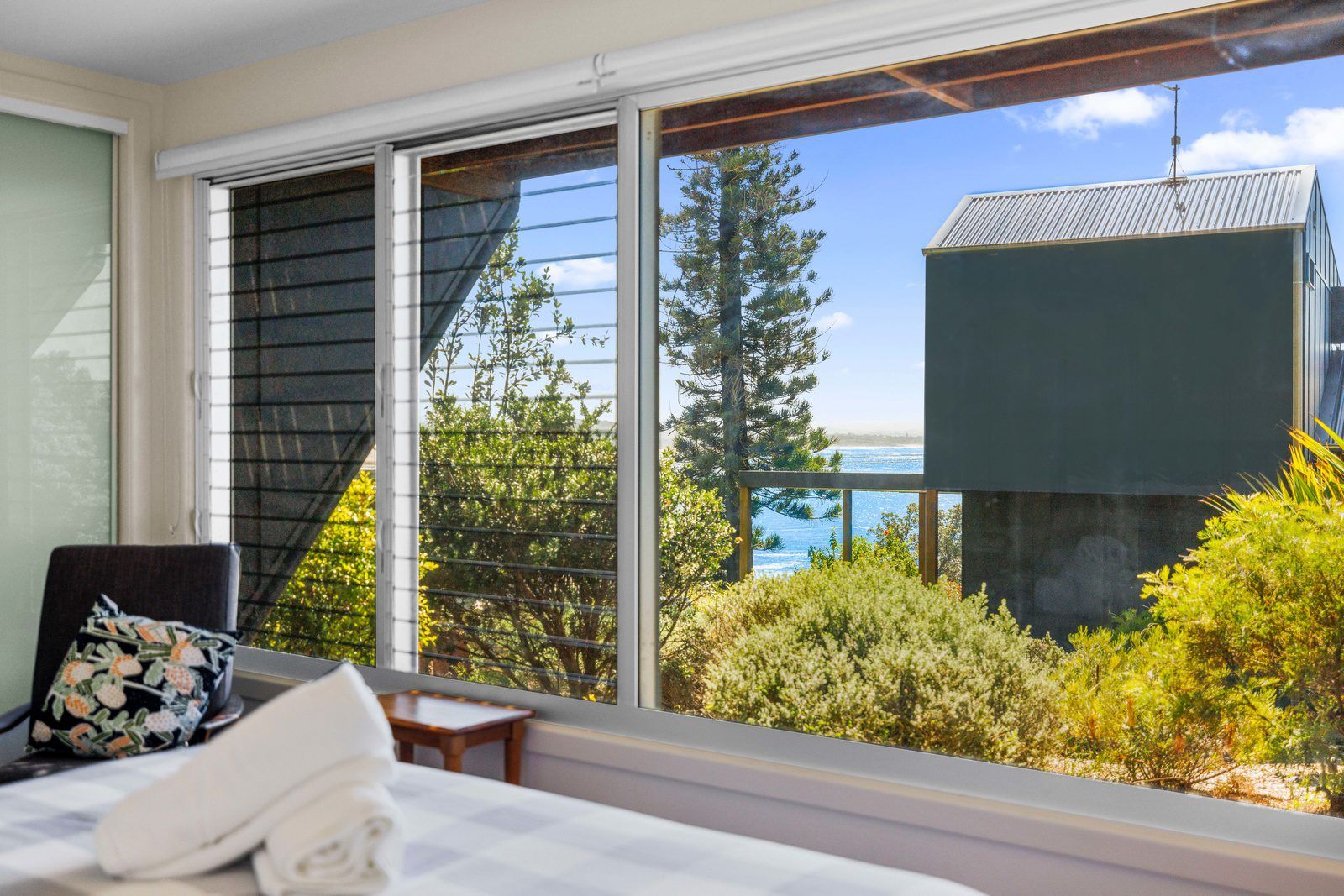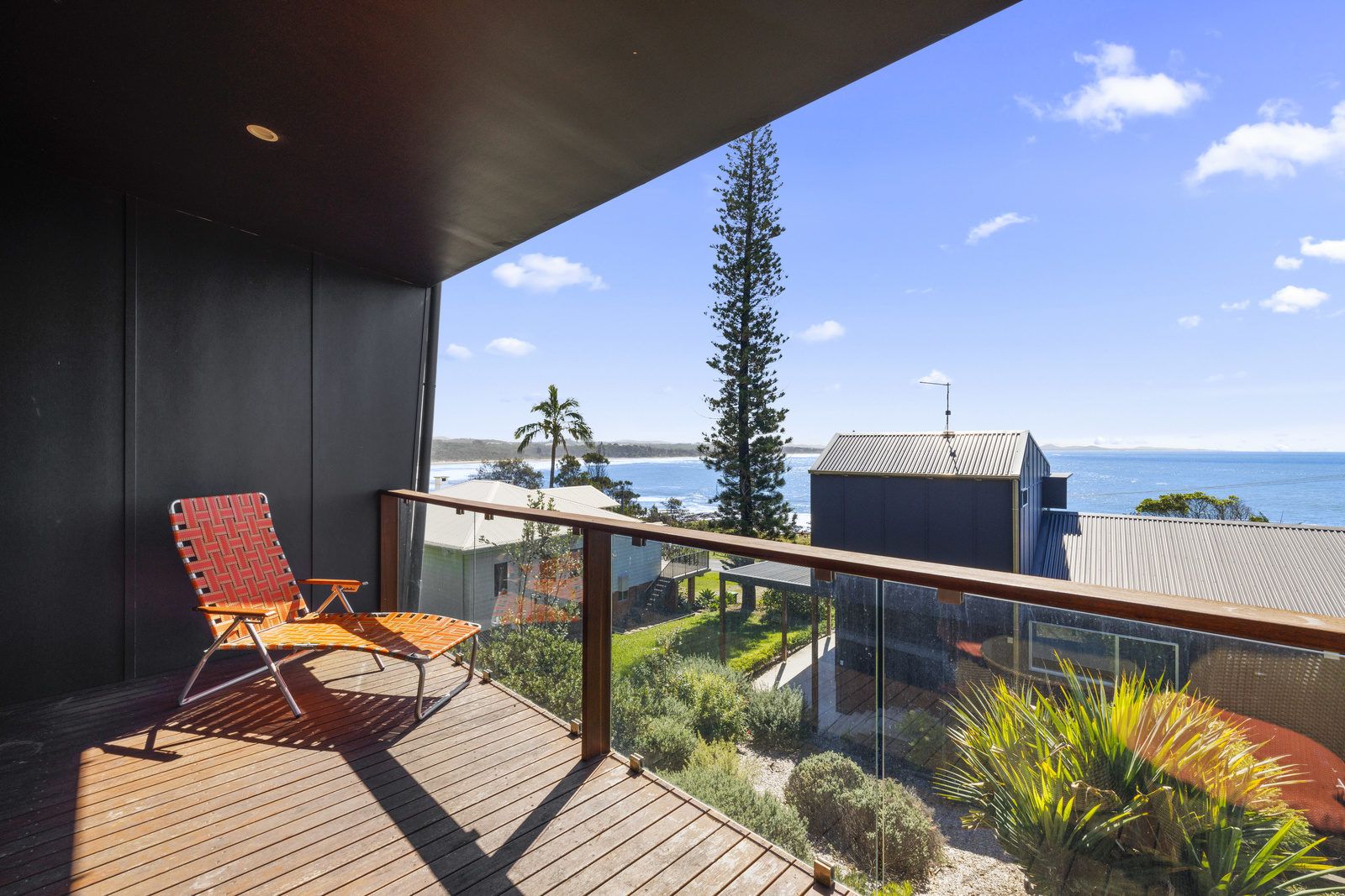The house boasts two spacious bedrooms, both with built-in wardrobes. One with a Queen bed and the other with two single beds. A unique luxury bathroom with ocean views and a state-of-the-art kitchen including a dishwasher and ocean views from the kitchen sink! Step on to your private balcony to soak up the headland atmosphere or relax in the open plan split level dining/ living area.