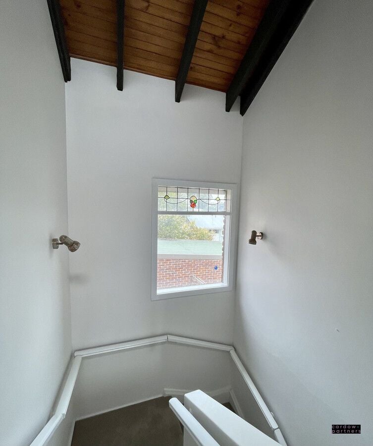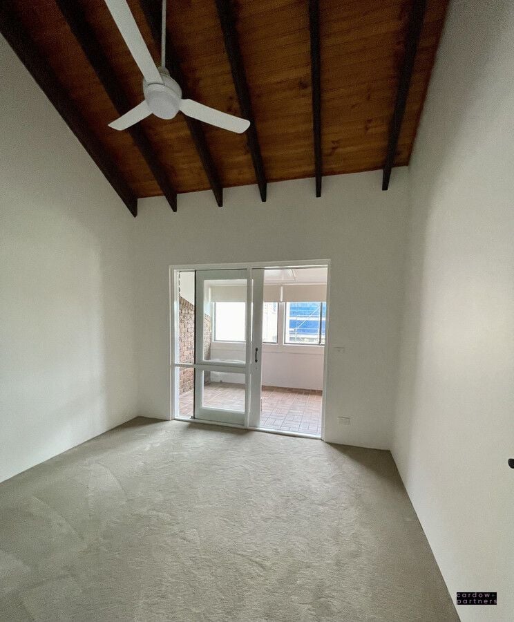 UPSTAIRS: beautiful high ceilings with exposed rafters, Three bedrooms, two with Built-ins and all with ceiling fans. The Main bedroom features a split system air-con.