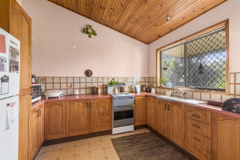 A basic design with both bedrooms carpeted & built in robes. The kitchen is timber with feature timber ceilings eye catching.