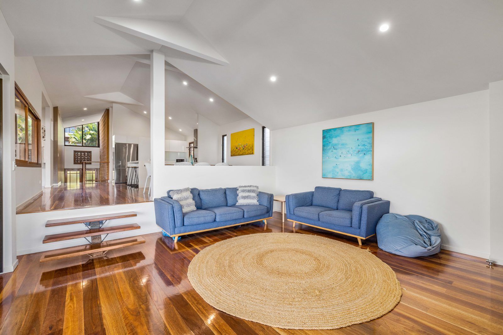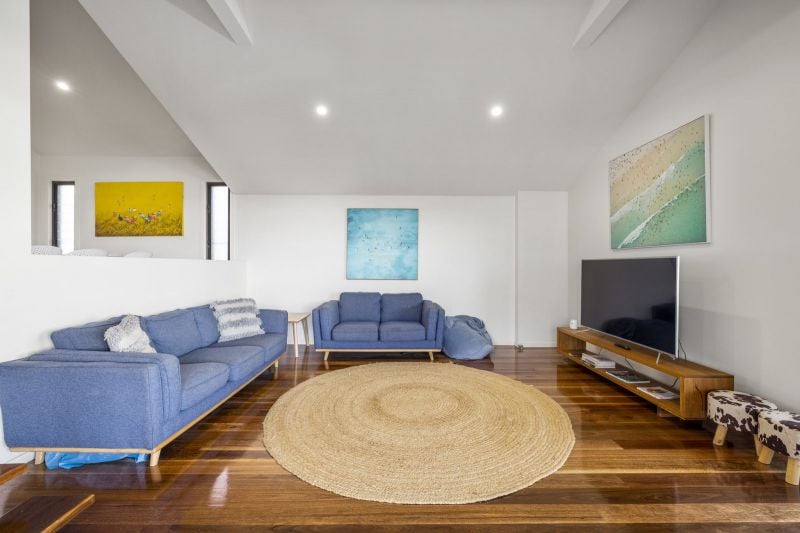 As you walk in the large timber front door you are invited to take stairs down to the lower level where you will find three bedrooms, laundry, bathroom, separate toilet & two living areas. In the first bedroom as you walk down the downstairs hallway you will find a set of single bunk beds, next door to this room is another bedroom with a queen bed. Continue down the hallway & before you reach the first downstairs living there is another bedroom with two single bunks. The end of the hallway opens to two living areas one on the same level with a large TV & another a couple of steps down. Flowing of the second living area downstairs there is a large lower deck which flows into the backyard, the perfect kids retreat.