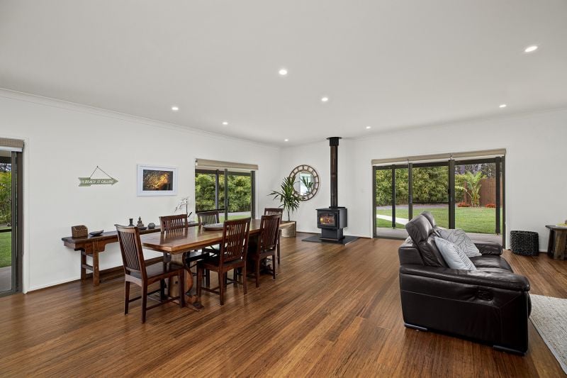 - Open plan living with wood heater