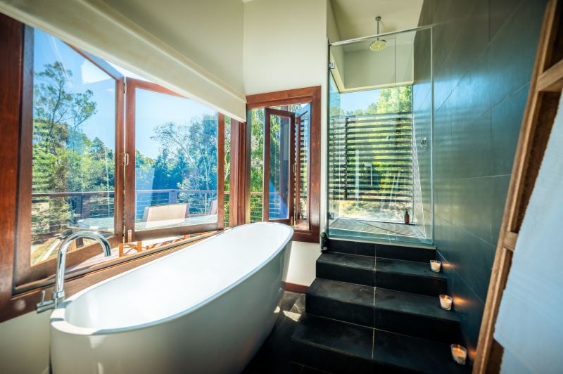 - Natural bluestone tiling in bathrooms with unique cat's paw grain imprints