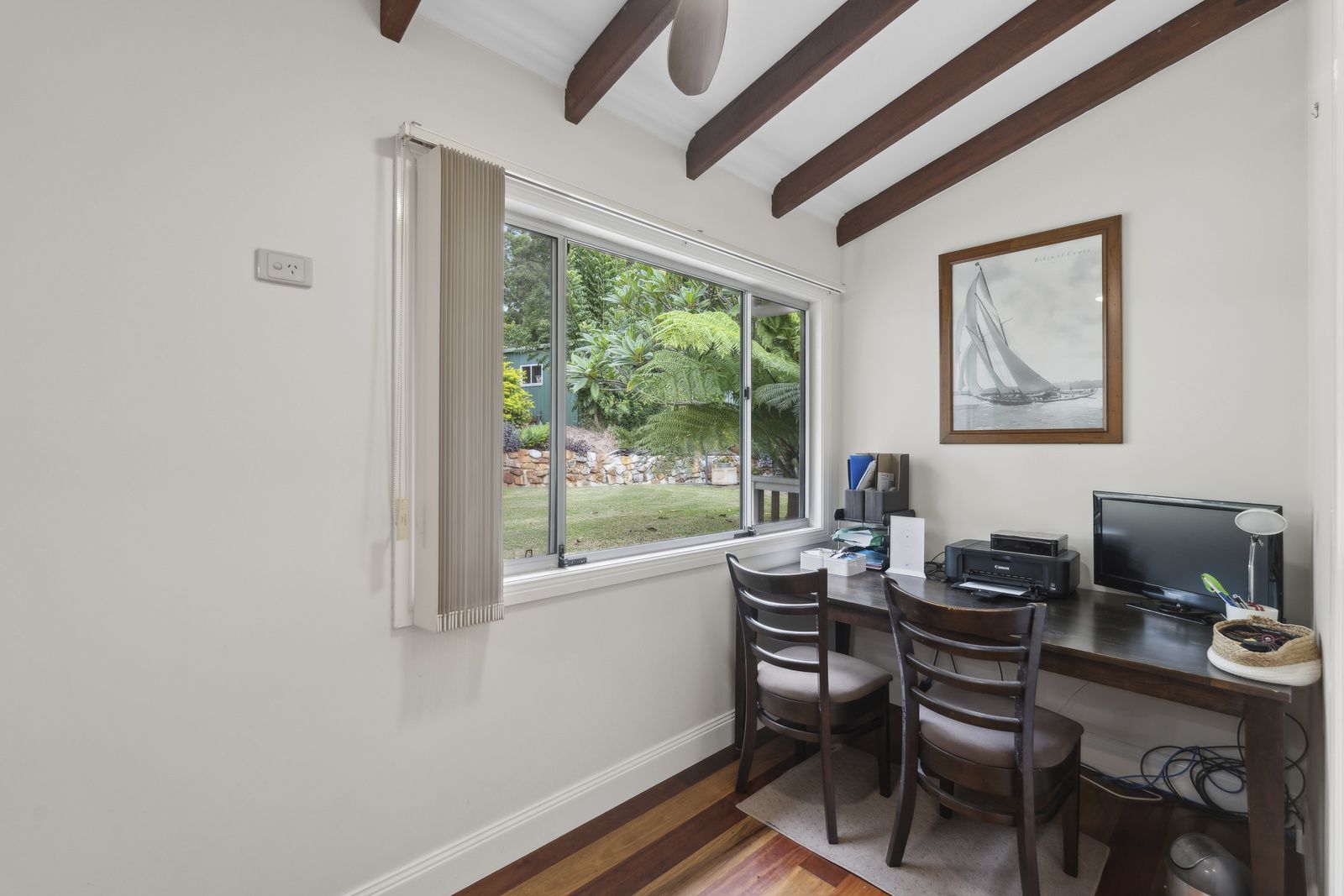 The well-maintained home offers three bedrooms, an office, and two bathrooms. The kitchen is equipped with a Falcon double electric oven and gas stove, while the spacious open-plan living room features raked ceilings that seamlessly flow into the outdoor entertaining area, showcasing stunning mountain views. The home also boasts hardwood timber floors and a slow-combustion wood fire for cozy winter nights.