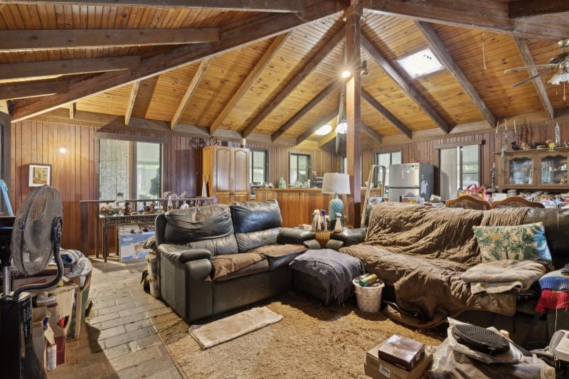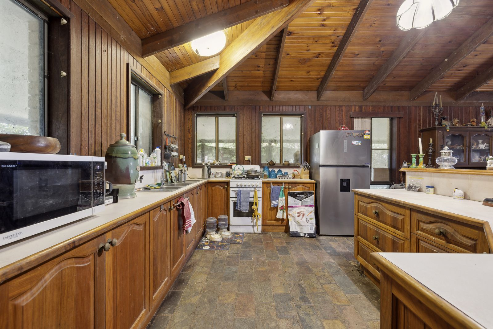 - Open plan living area with cathedral ceilings, slow combustion wood fire