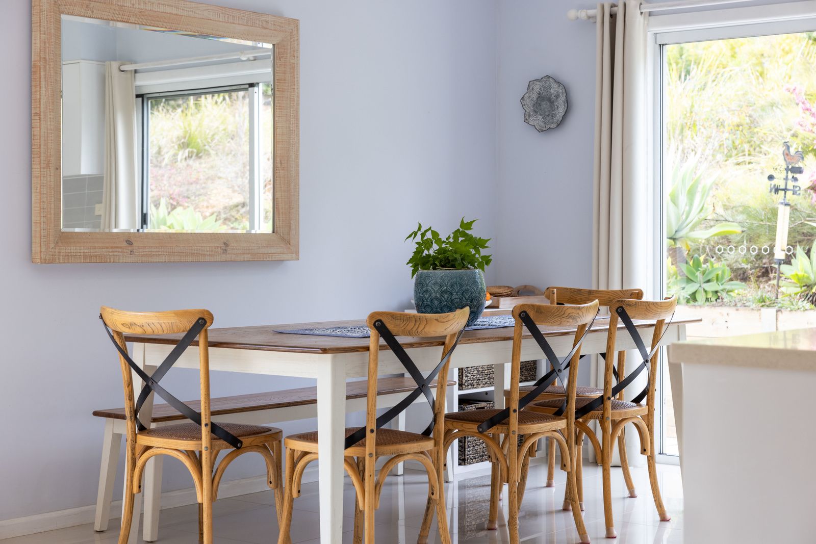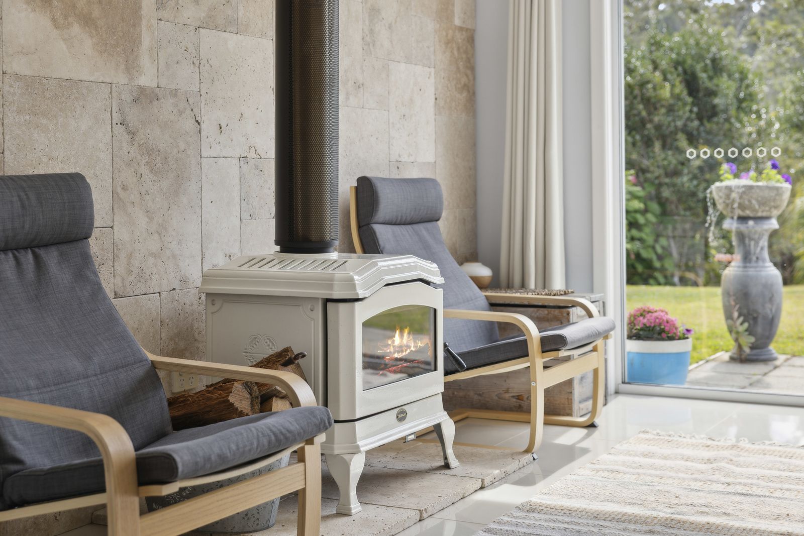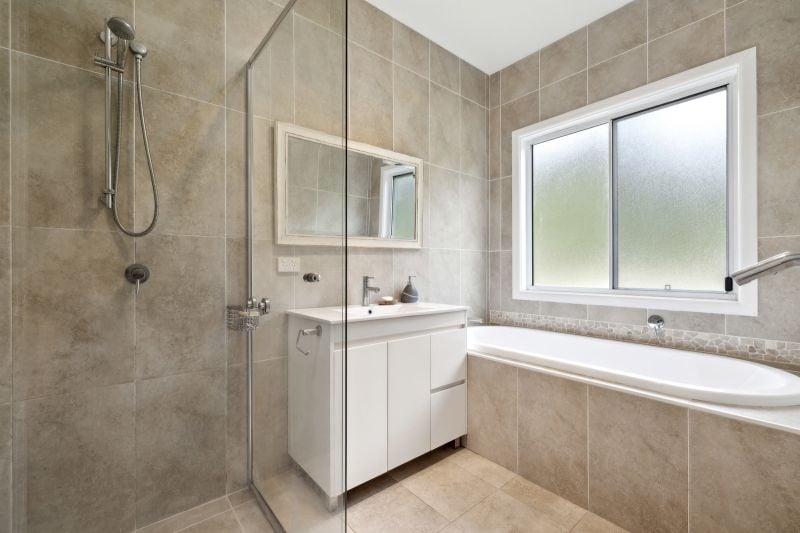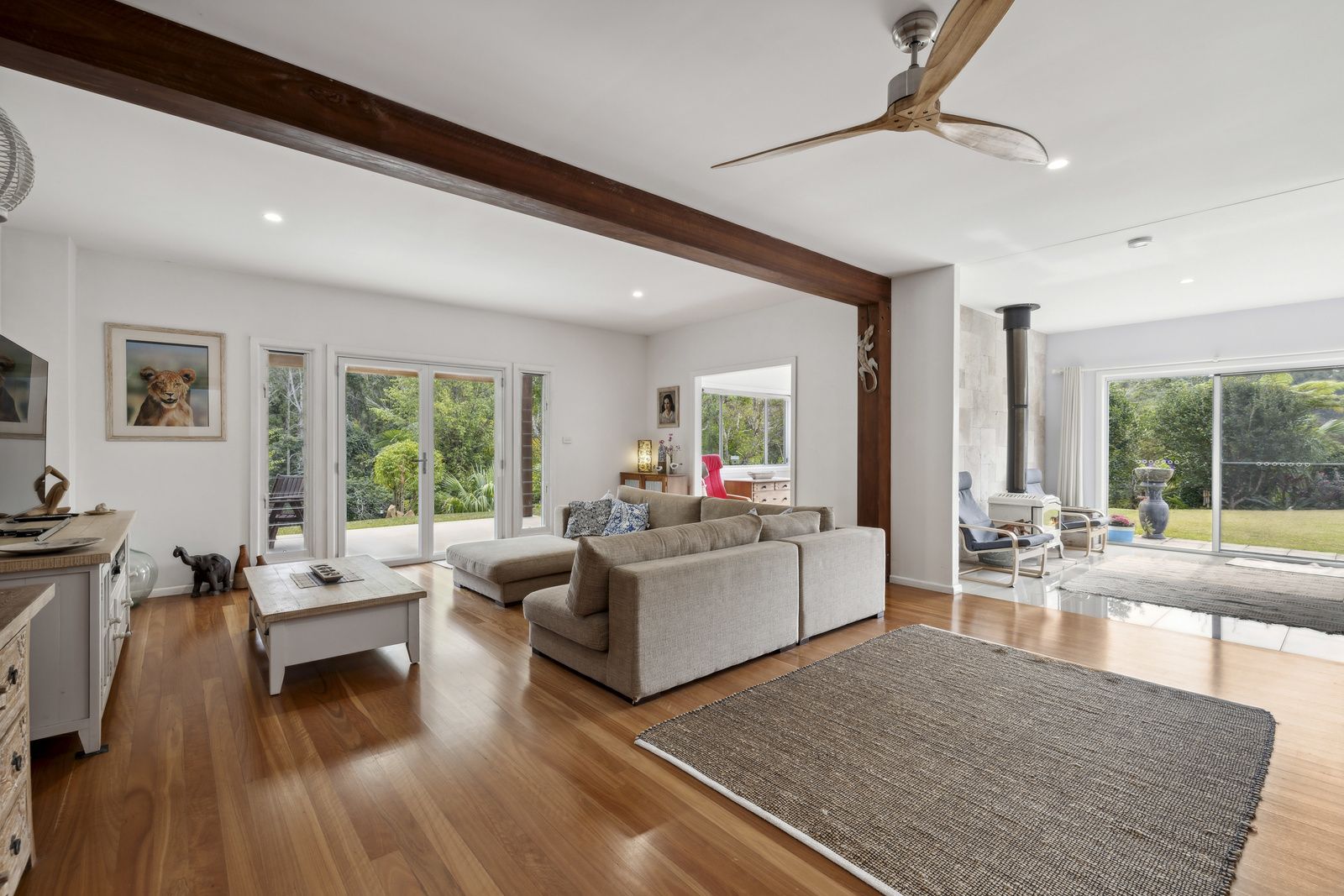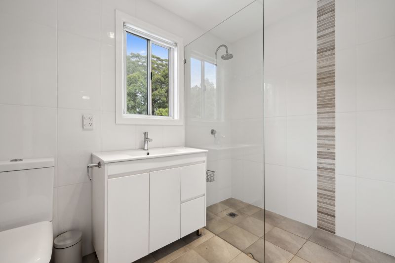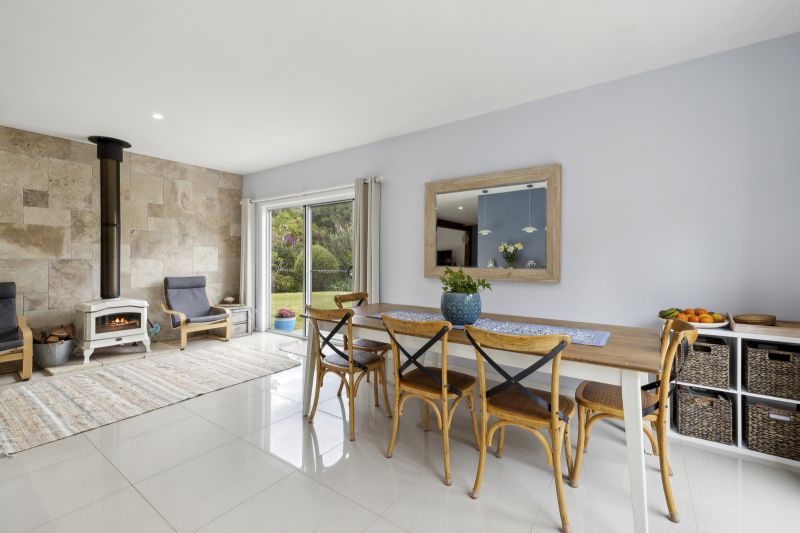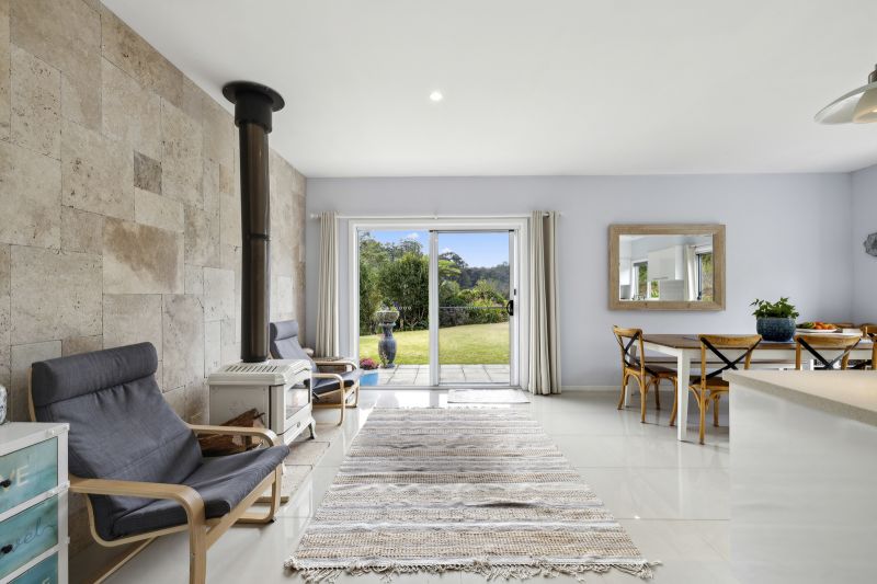 The kitchen features a Caesarstone bench top, gas cooktop, and electric oven. It opens up to a dining area and includes a slow combustion wood fire for warmth during the cooler months. The living area is spacious, with timber floors and lovely views of the garden and wildlife. Downstairs also houses two bedrooms and a well-maintained bathroom with floor-to-ceiling tiles, a separate bath, and shower.