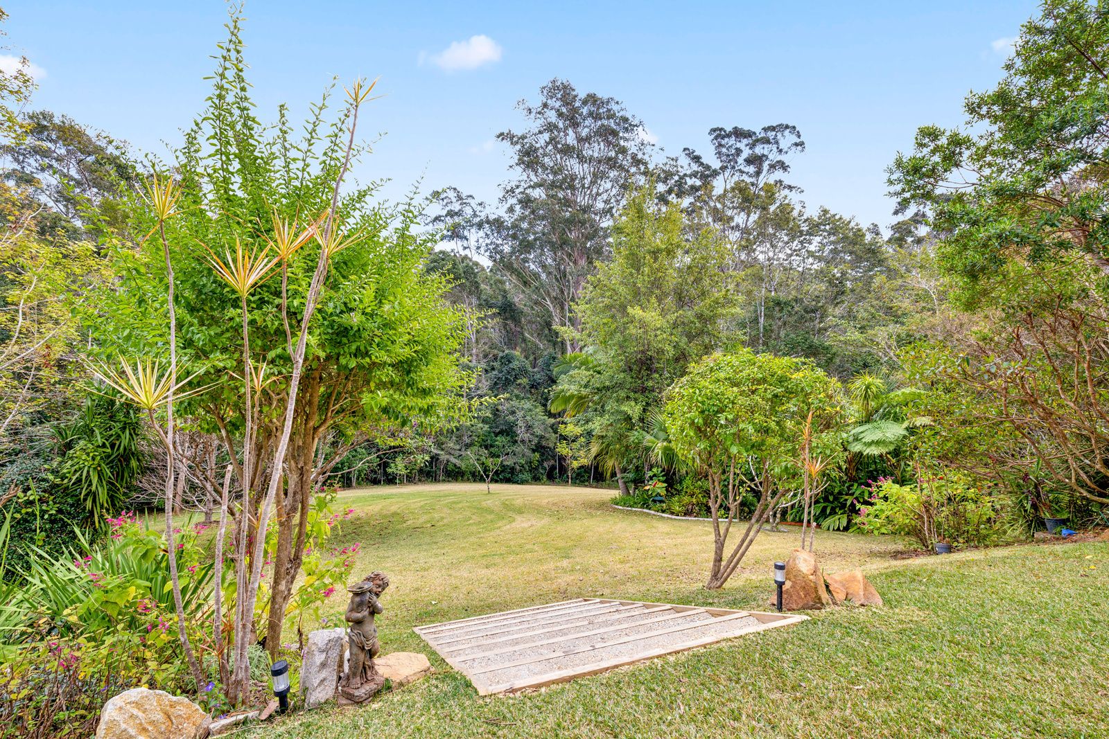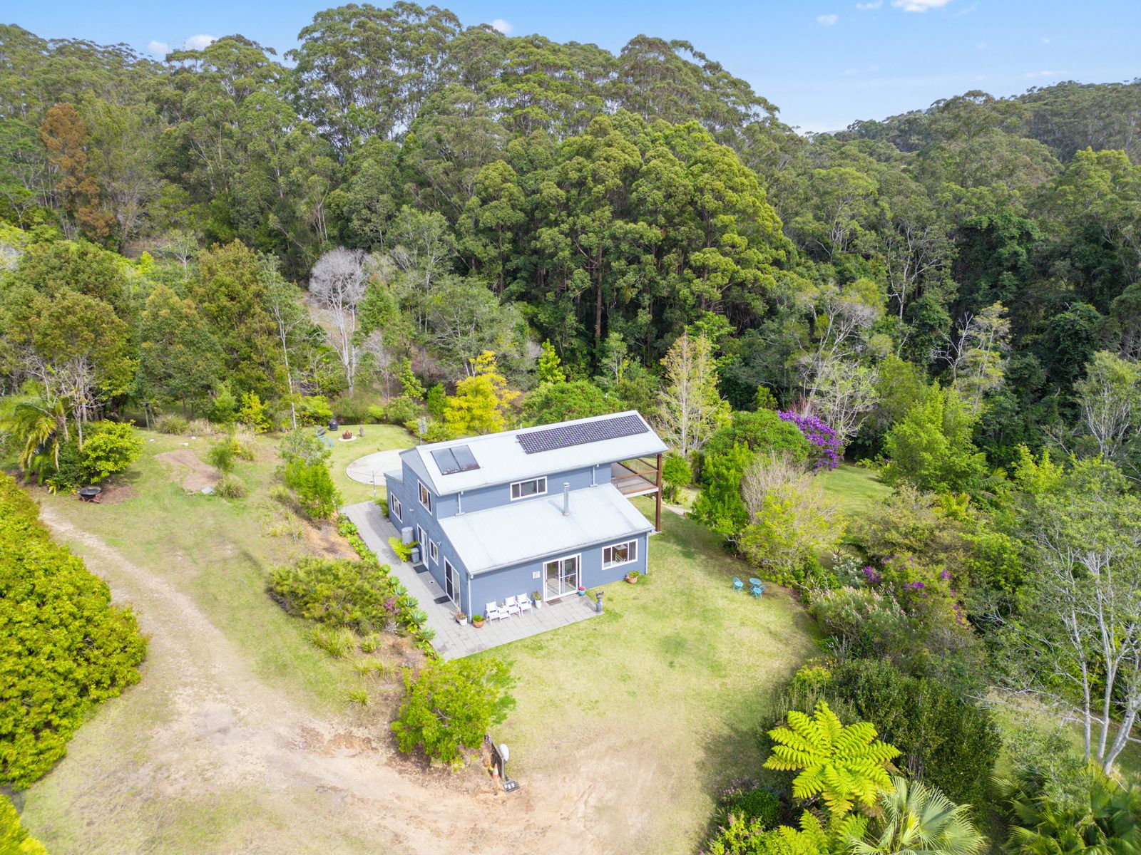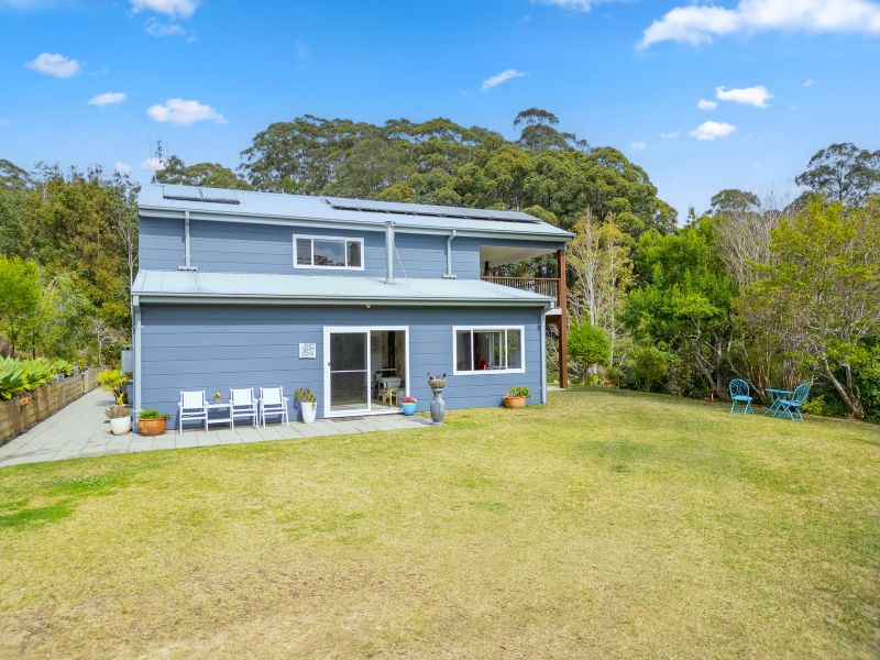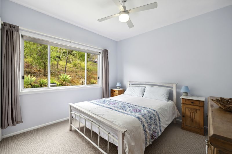 Outside, the established gardens feature a garden shed with a concrete floor, as well as veggie beds and fruit trees including mango, persimmon, banana, custard apple, macadamia, and paw paw. The property boasts a reliable water supply with 90,000L of rainwater storage and 2.2kw of solar power. The natural forest surrounding the property is home to abundant birdlife and wildlife. Plus, with Nambucca Heads just a 16-minute drive away, the location offers both seclusion and convenience.