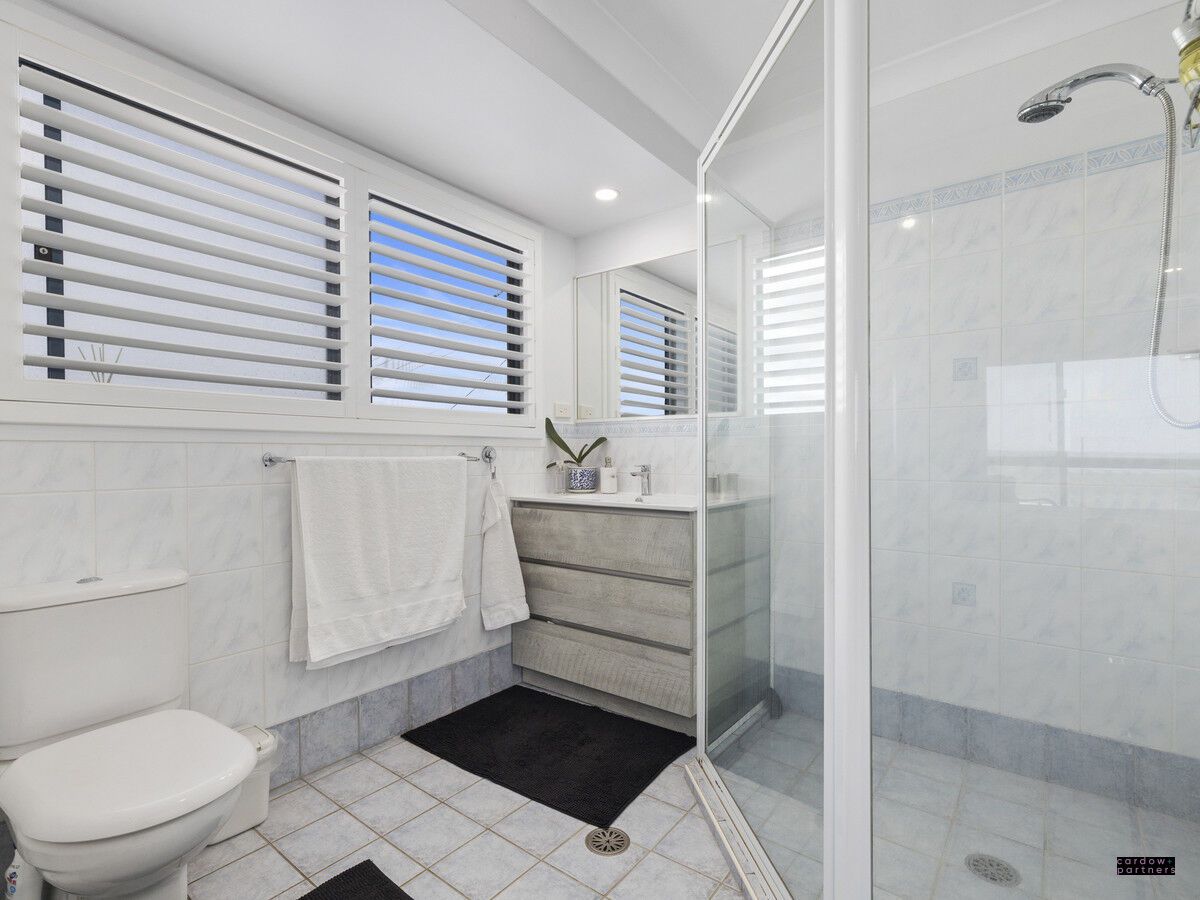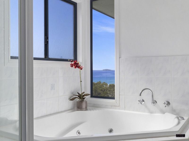 Upstairs offers three carpeted bedrooms plus a study or optional fifth bedroom. The generous master suite enjoys stunning ocean views, a walk-in robe and ensuite. Two additional bedrooms include built-in wardrobes and are conveniently positioned near the main bathroom, with one bedroom and the bathroom also capturing ocean views towards the lighthouse.