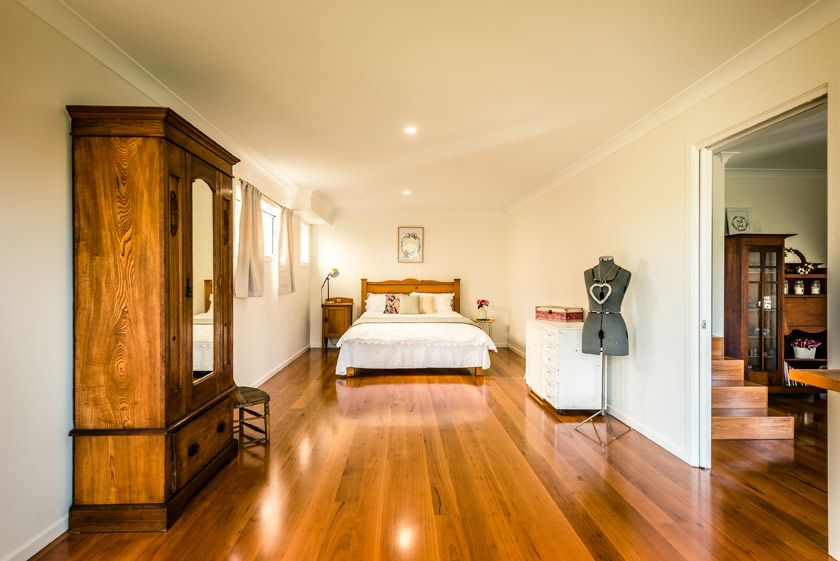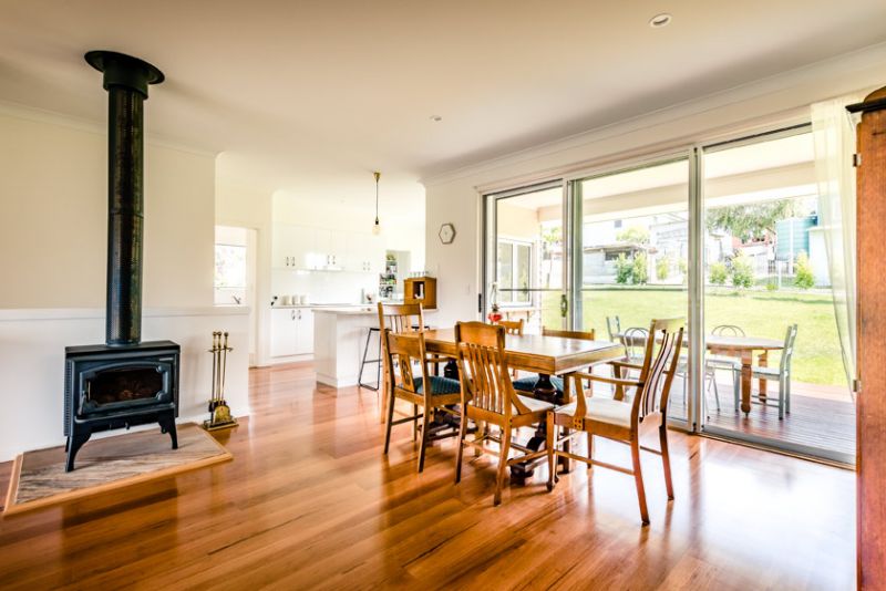 Inside the home is complete with modern kitchen including walk in pantry, open plan lounge & dining room with cosy wood heater, 3 bedrooms all with built-in wardrobes and ceiling fans, main with walk in robe and spacious tiled ensuite, Blackbutt timber floors throughout, high ceilings, modern main bathroom with clawfoot bath, rear covered entertaining area with kitchen servery, remote access double lock up garage & downstairs guest or rumpus room.