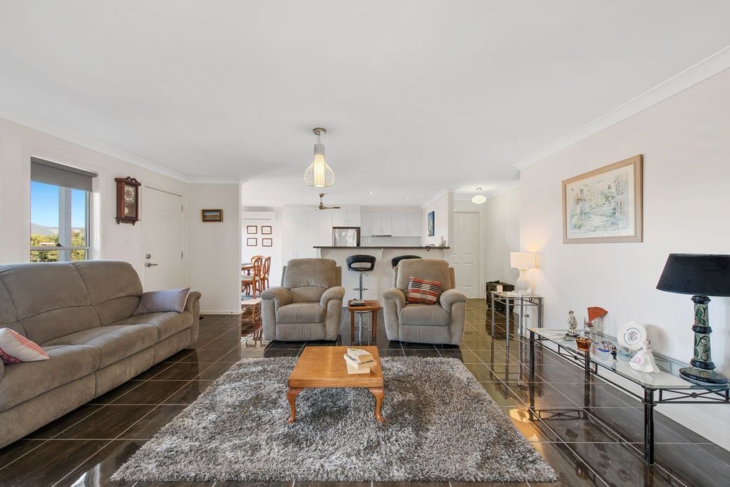 The living/dining/kitchen (4.9 x 5.4m) is fully tiled, open plan with lovely elevated views and reverse cycle air conditioning. The kitchen is a comfortable size with electric stove, range hood, oven, dishwasher, double sink and breakfast bar.